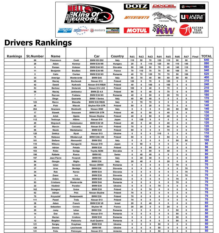 Medzi najvačšie lákadlá tohto podujatia určite môžeme zaradiť účasť až 60-tich jazdcov z 21 rôznych krajín ktorý sú momentálne prihlasený. Najvačší ašpiranti na titul F.Conti, A.Kerényi, R.Kolesár, B.Boulbes a C.Ciortan sa budú musieť prebojovať cez poľských top drifterov ako M.Bochenek, D.Karkosik, B.Stolarski a talianskeho jazdca A.Monteverde, ktorí im v rebríčku dýchajú na chrbát. Aktuálne poradie jazdcov pred finálovým kolom nájdete v tabuľke pod článkom. Sťažiť zisk dvojnásobného počtu bodov z tohto podujatia prídu účastníkom aj Daigo Saito, Tetsuya Hibino a Mitsuru Haruguchi. Spomenme aj P.Trela, M.Wartalowicz, N.Szanto a samozrejme naši jazdci Noro Kováčik, Robo Szolga, Tomáš Ježek, Igor Ochotnícky a Peter Kurnava.