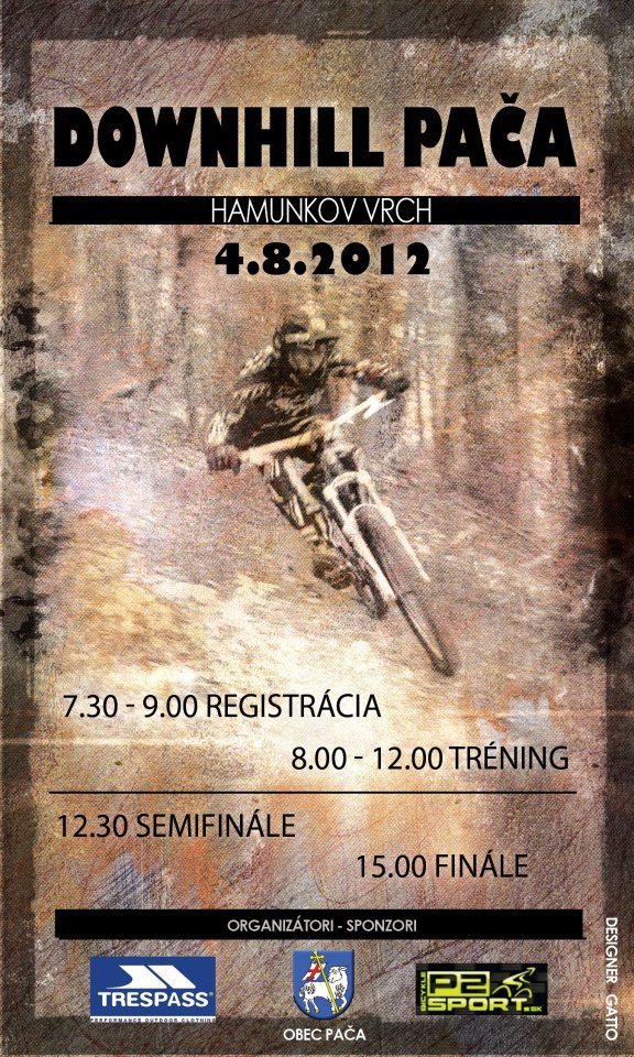 Príďte si túto sobotu (4.8.2012) všetci zajazdiť do Pače. Koná sa tam lokálny downhillový pretek. Už ráno od 7:30 do 9:00 prebieha registrácia a jazdci, ktorí si privstanú môžu už od 8:00 začať trénovať. Tréning bude trvať do 12:00 a od 12.30 začnú semifinálové jazdi. Finále sa odohrá o 15tej hodine.