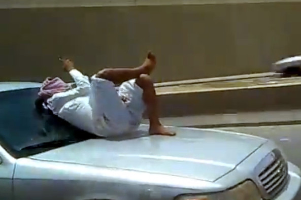 Hlavným hrdinom videa, ktoré zachytáva odvážlivca v akcii, je muž odetý v tradičnom arabskom oblečení, ktorý spokojne sedí a neskôr aj leží na kapote auta idúceho rýchlosťou približne 80 km/h! Svoj nebezpečný kúsok si evidentne vychutnáva, pričom sa stíha venovať aj svojmu mobilu. Nepochybne ide o zaujímavý spôsob adrenalínového osvieženia, no múdrejšie a bezpečnejšie bude za týmto účelom využiť osvedčenú klimatizáciu. Samozrejme za predpokladu, že je ňou vaše auto vybavené.