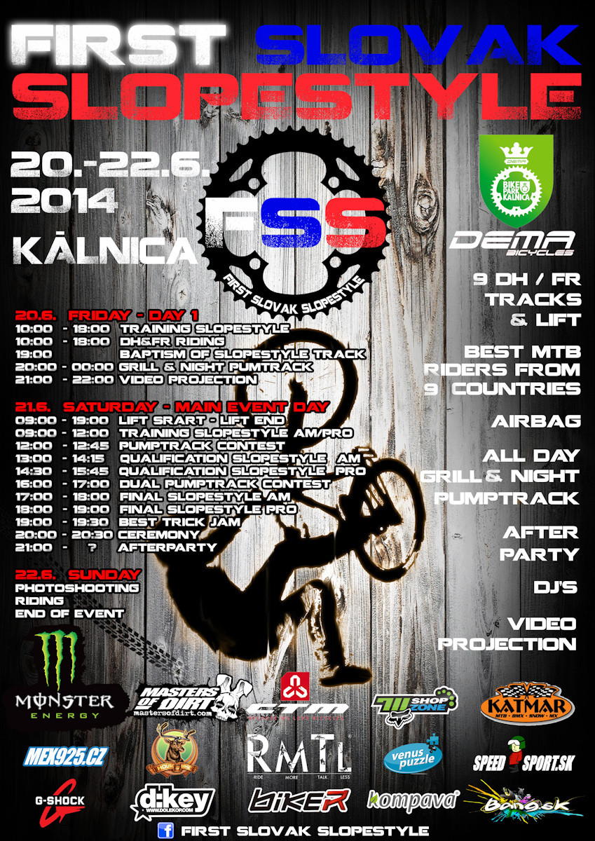Srdečne Vás pozývame na jedinečnú akciu, ktorú Slovensko ešte neochutnalo. First Slovak Slopestyle je medzinárodný závod freestyle bicyklov slopestyle na trati s umelo vytvorenými prekážkami v krásnom prostredí Bike Parku Kálnica. Termín konania tejto výnimočnej akcie je stanovený na víkend 20-22.6 .2014
