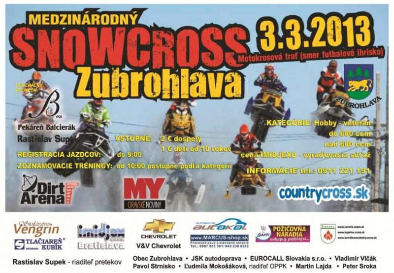 Všetkých nadšencov a priaznivcov snežných skútrov by sme týmto chceli srdečne pozvať na skvelú akciu, ktorá sa bude konať dňa 3. marca 2013 na motokrosovej trati v Zubrohlave. Odohrajú sa tam medzinárodné snowcrossové preteky. Trať bude špeciálne upravená na preteky snežných skútrov. Určite sa bude načo pozerať, nakoľko je prisľúbená aj účasť domácich jazdcov a taktiež jazdcov z Čiech, Poľska, Nemecka a Rakúska. Pre víťazov sú pripravené zaujímavé ceny, diváci sa môžu tešiť na úžasnú atmosféru a bohaté občerstvenie. Tak neváhajte a príďte si užiť prvý marcový víkend spolu s nami do Zubrohlavy.