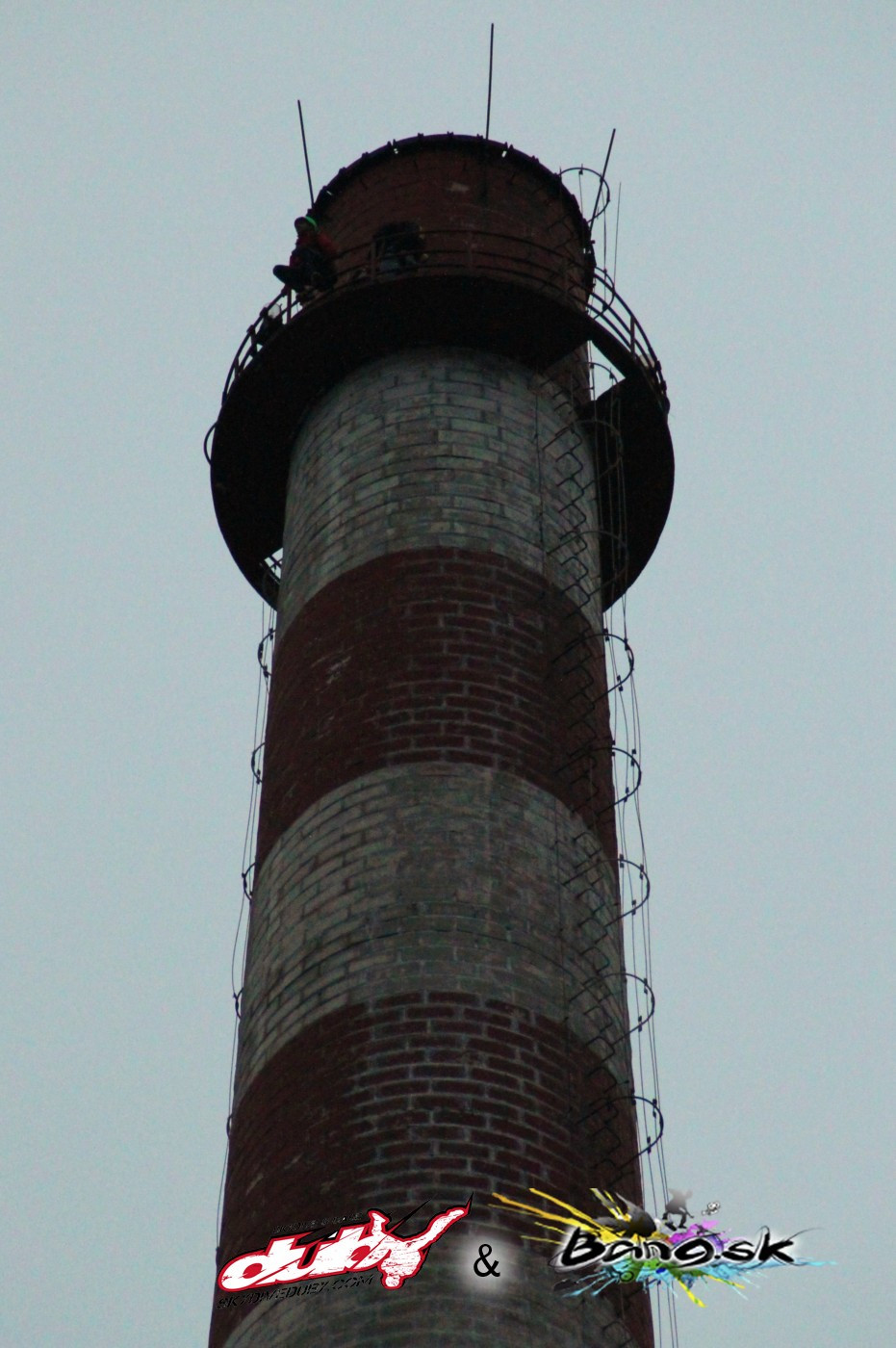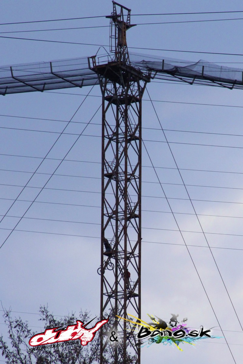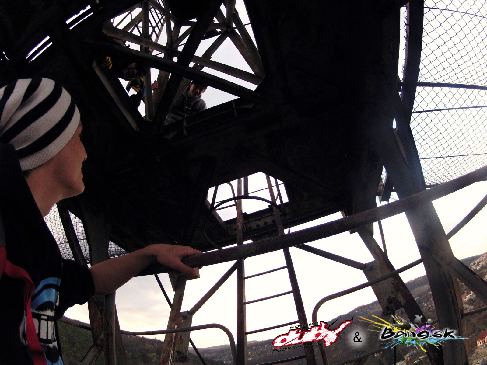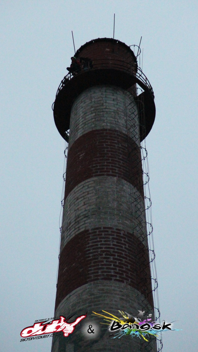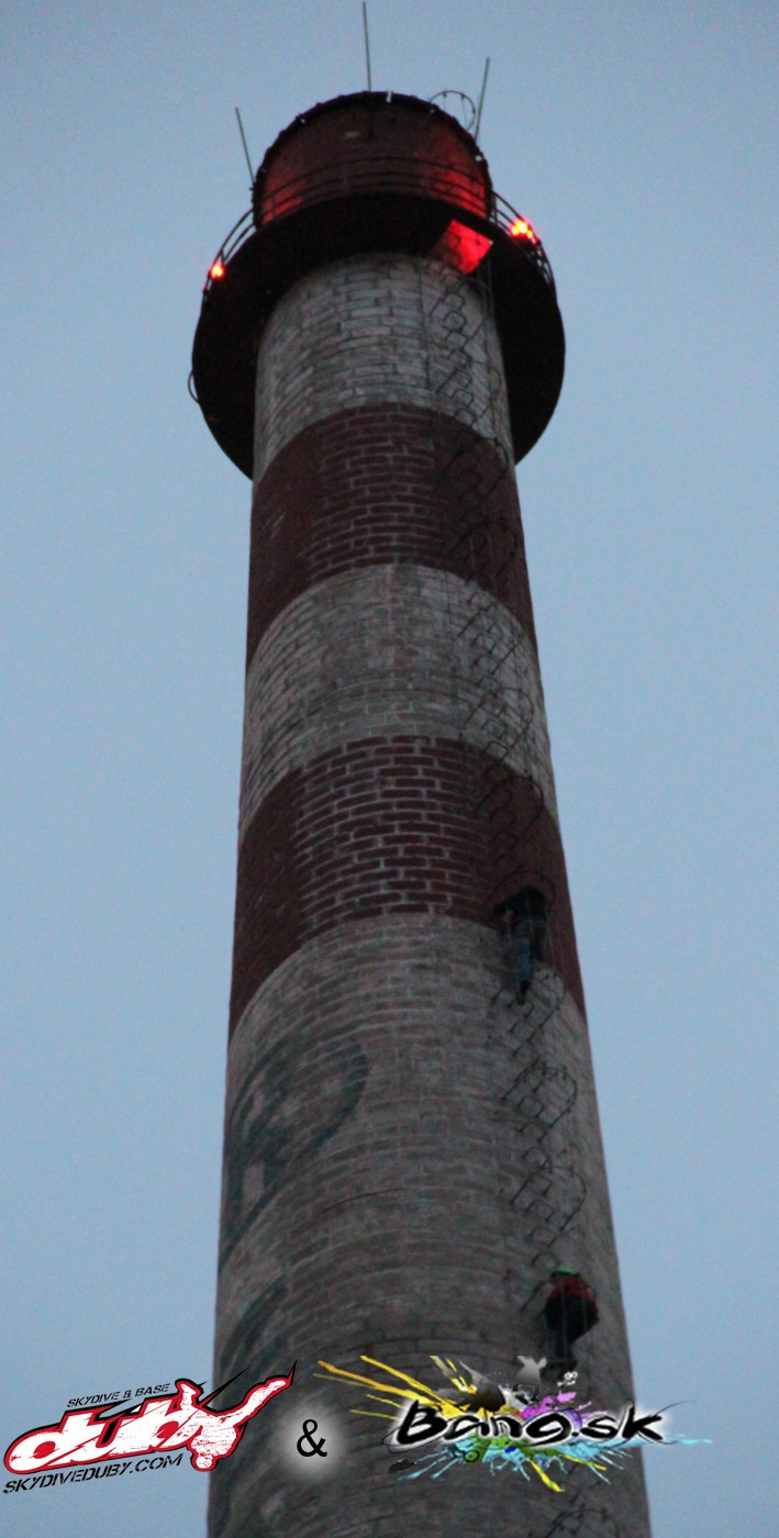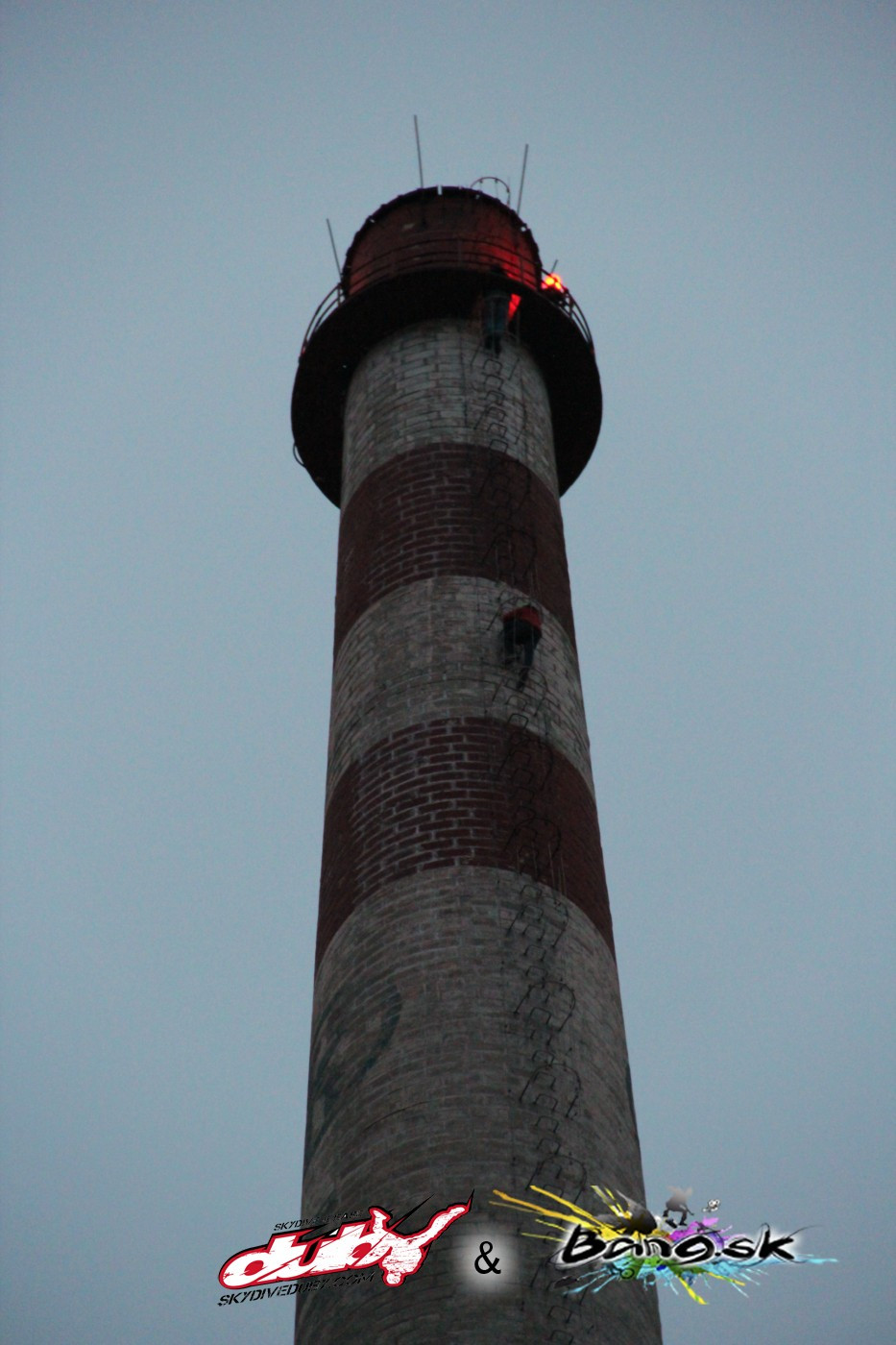 Prichádzam na miesto určenia prvý, akurát sa stihnem vydýchať a už vystupuje z auta jeden nemenovaný slovenský profesionálny base-jumper v sprievode šarmantnej hnedovlásky. Onedlho sú už na mieste aj ľudia z Bang.sk, Wrc Hsp felicia s riders posádkou a Angus. Krátky pokec, nachystanie techniky a už lezieme hore 80 metrovú vežu v zostave Roman, René, Bodkins, Kučo a ja (ncap). Každým poschodím sa ľudia dole zdali menší a menší ...