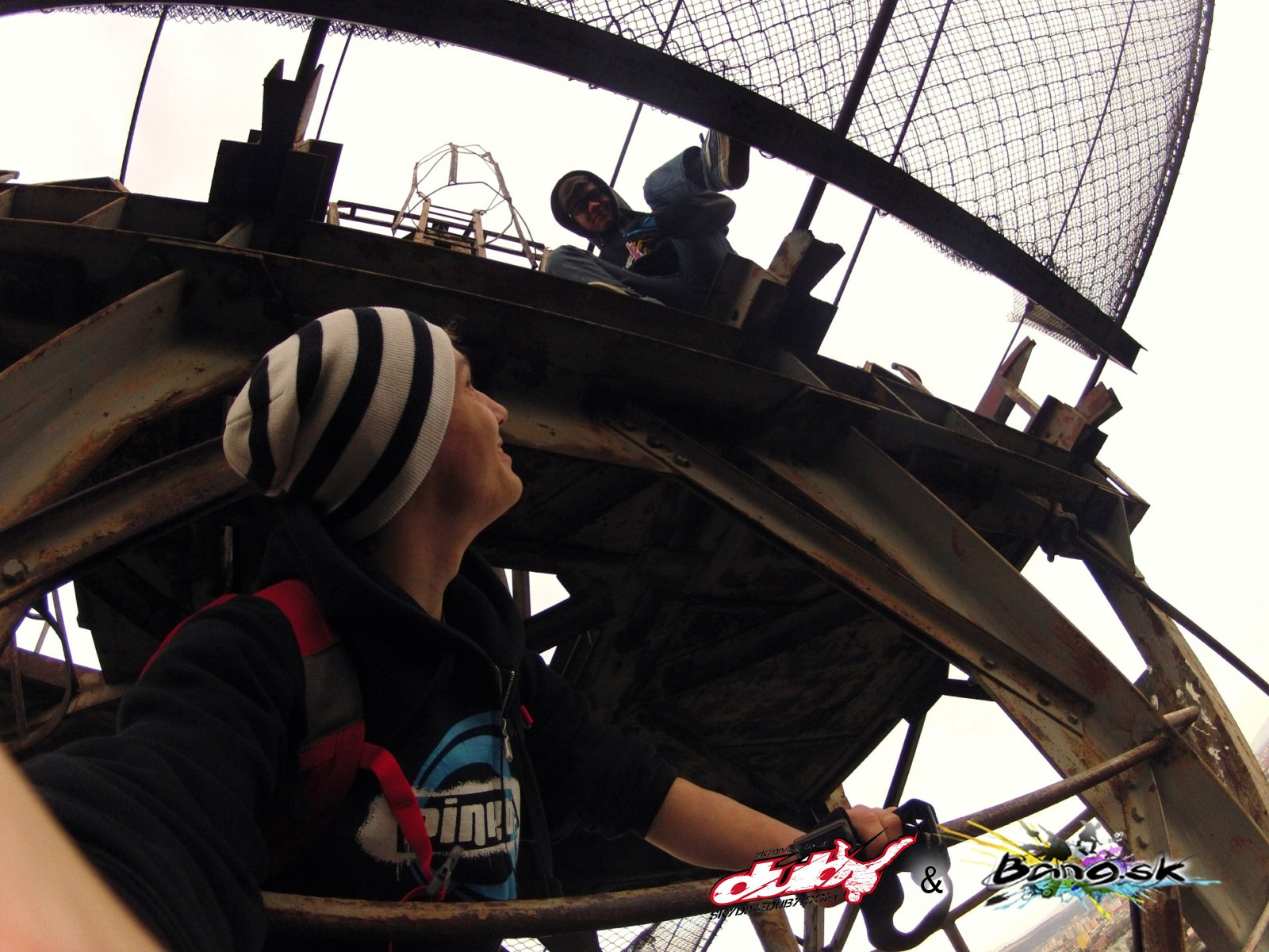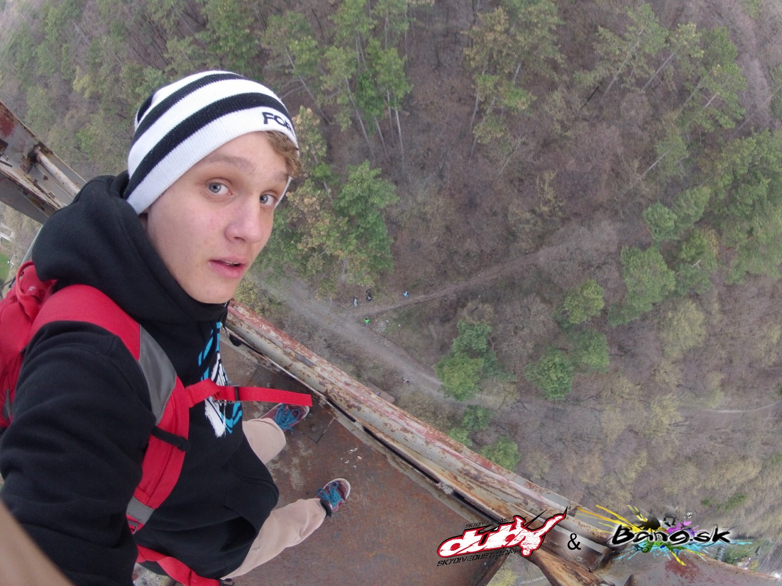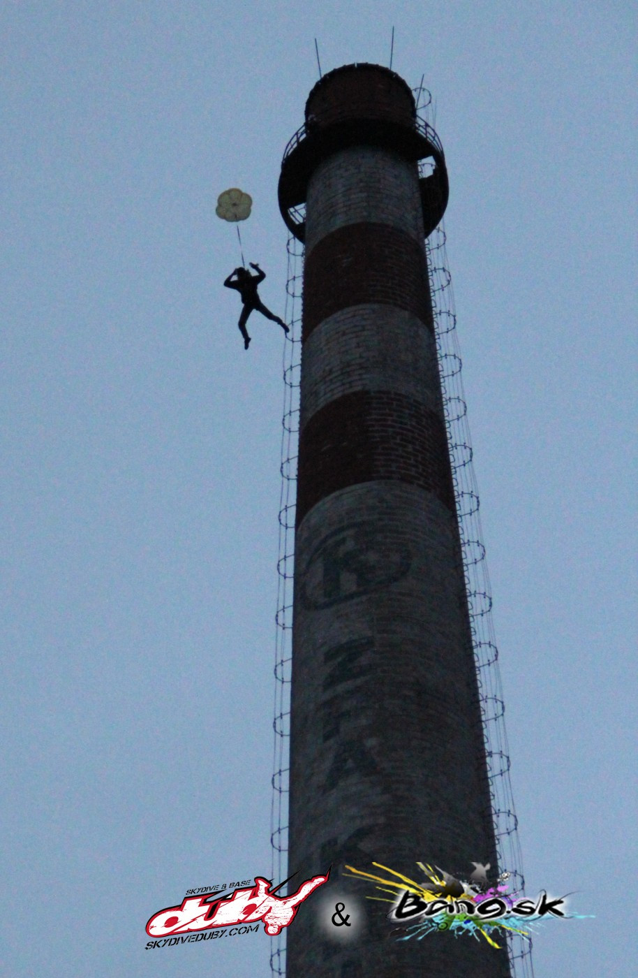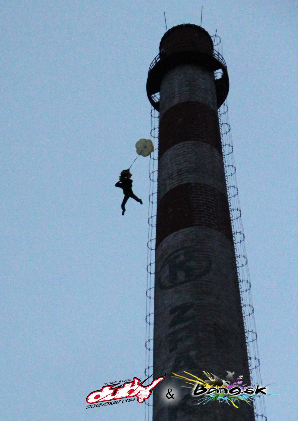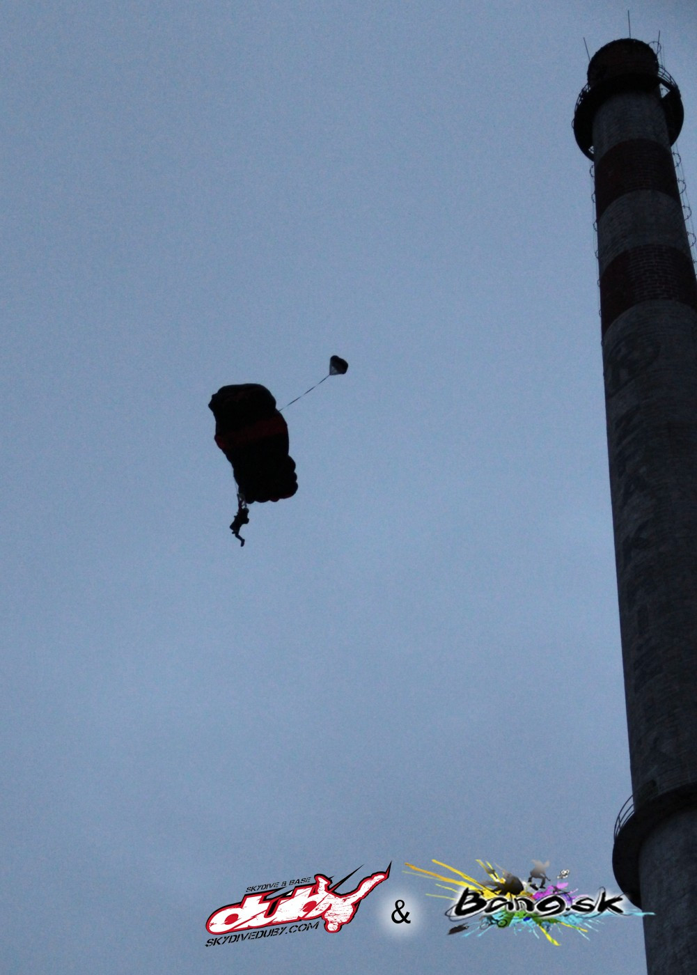 Prichádzam na miesto určenia prvý, akurát sa stihnem vydýchať a už vystupuje z auta jeden nemenovaný slovenský profesionálny base-jumper v sprievode šarmantnej hnedovlásky. Onedlho sú už na mieste aj ľudia z Bang.sk, Wrc Hsp felicia s riders posádkou a Angus. Krátky pokec, nachystanie techniky a už lezieme hore 80 metrovú vežu v zostave Roman, René, Bodkins, Kučo a ja (ncap). Každým poschodím sa ľudia dole zdali menší a menší ...