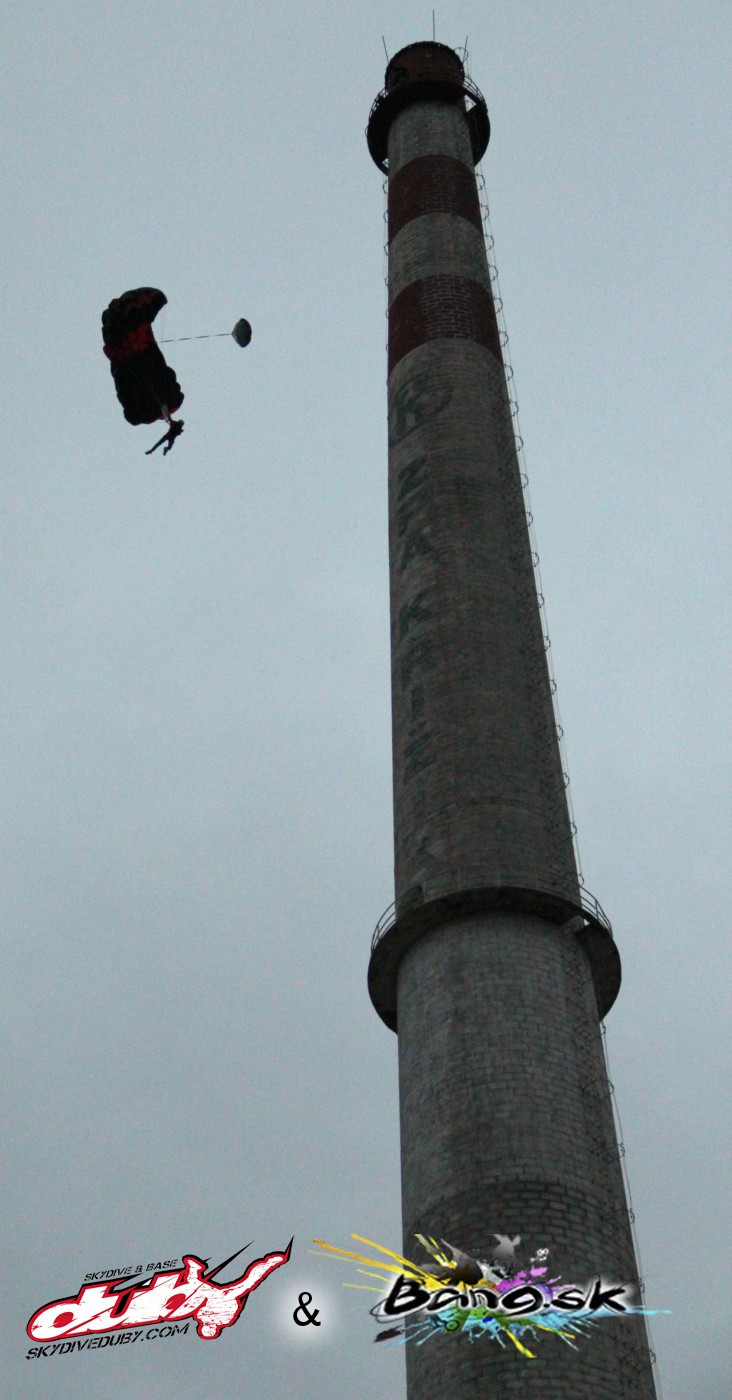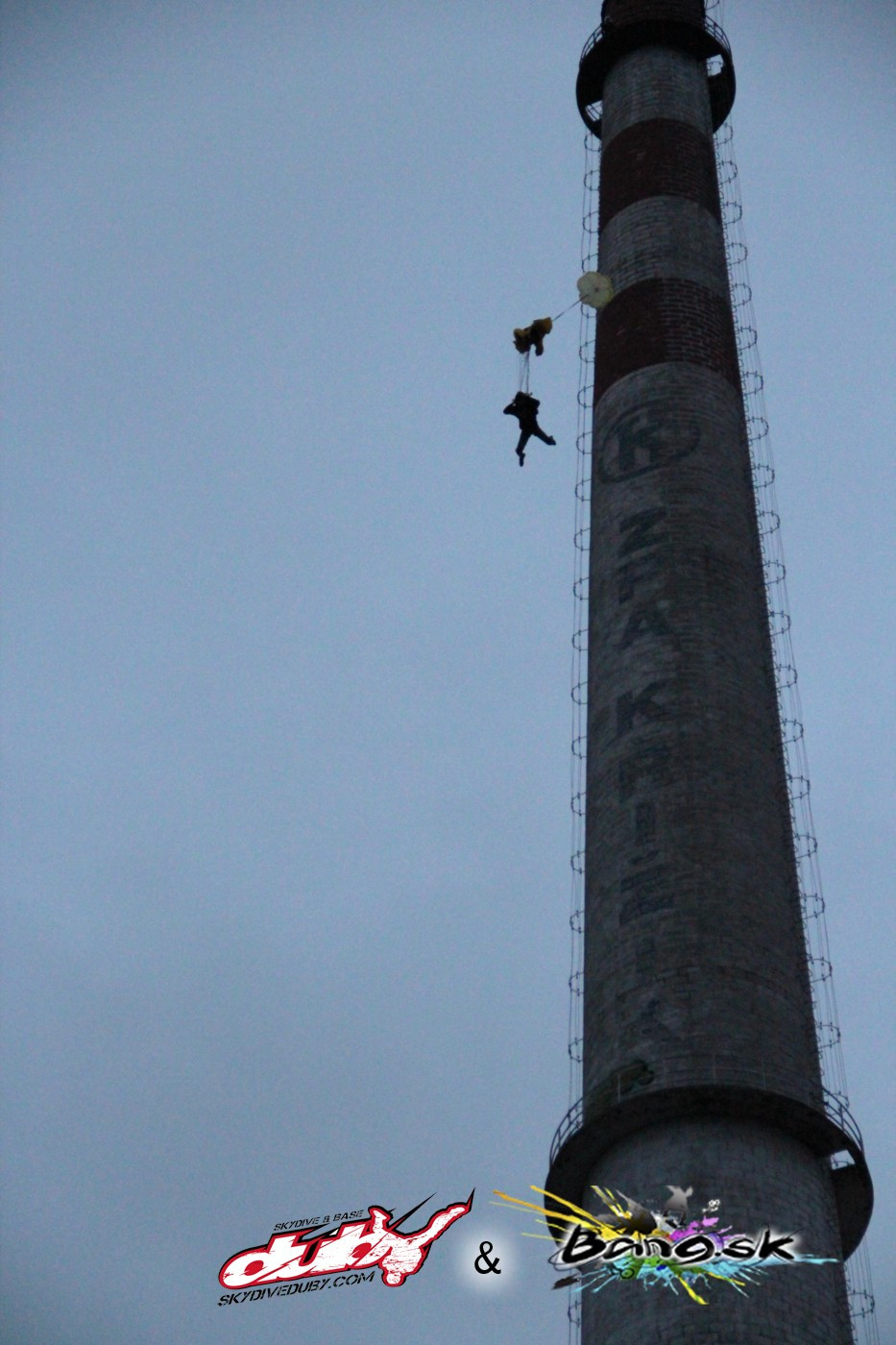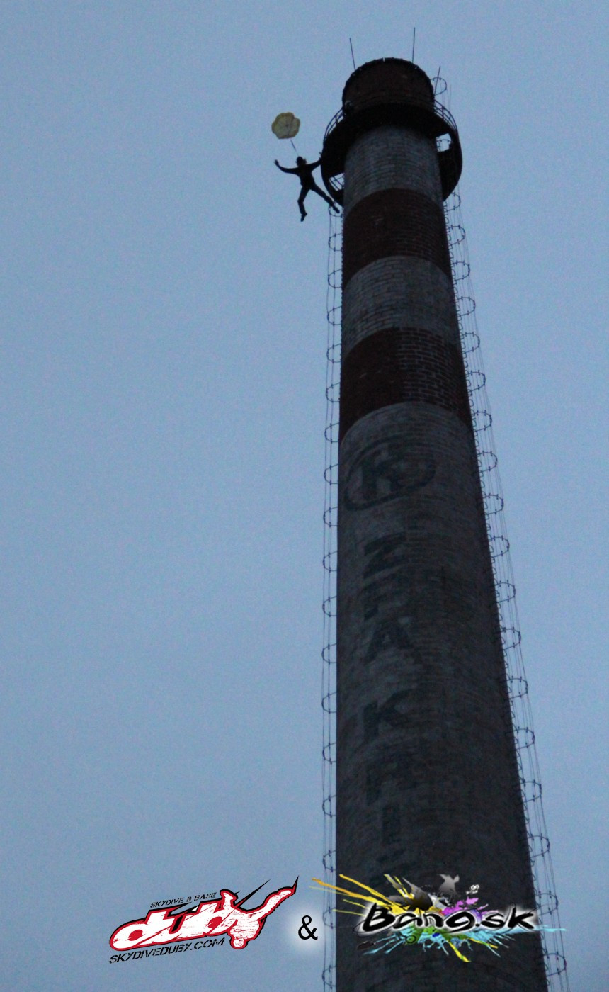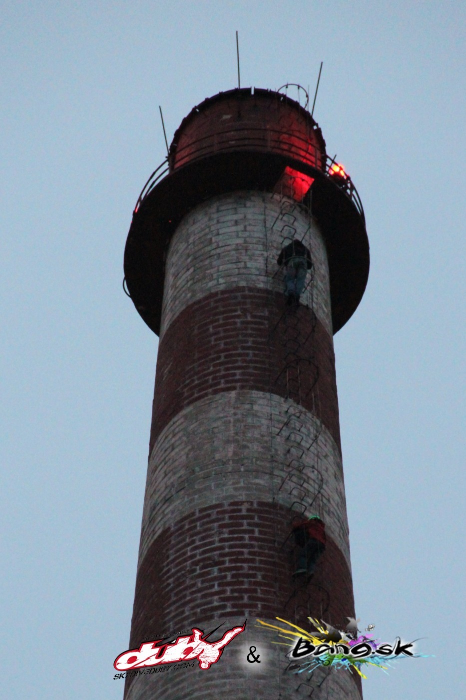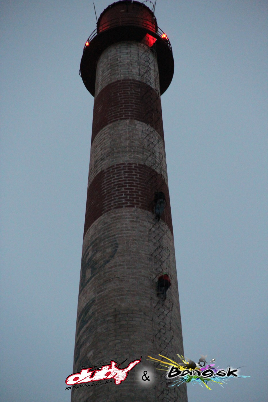 Prichádzam na miesto určenia prvý, akurát sa stihnem vydýchať a už vystupuje z auta jeden nemenovaný slovenský profesionálny base-jumper v sprievode šarmantnej hnedovlásky. Onedlho sú už na mieste aj ľudia z Bang.sk, Wrc Hsp felicia s riders posádkou a Angus. Krátky pokec, nachystanie techniky a už lezieme hore 80 metrovú vežu v zostave Roman, René, Bodkins, Kučo a ja (ncap). Každým poschodím sa ľudia dole zdali menší a menší ...