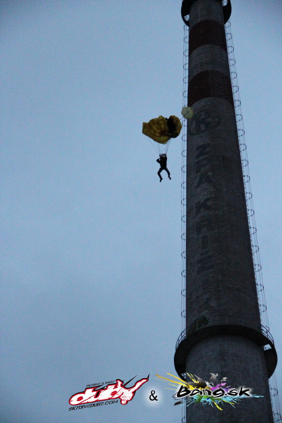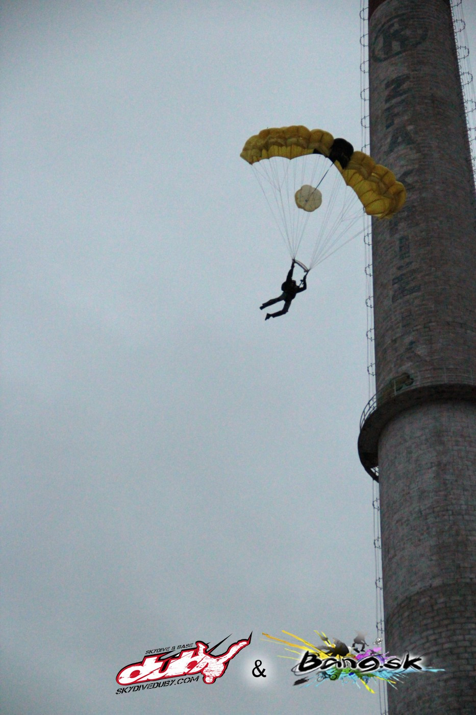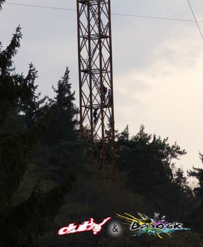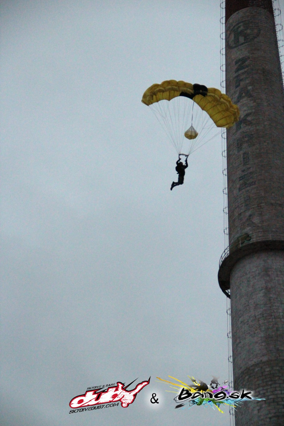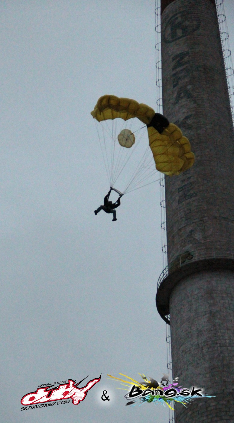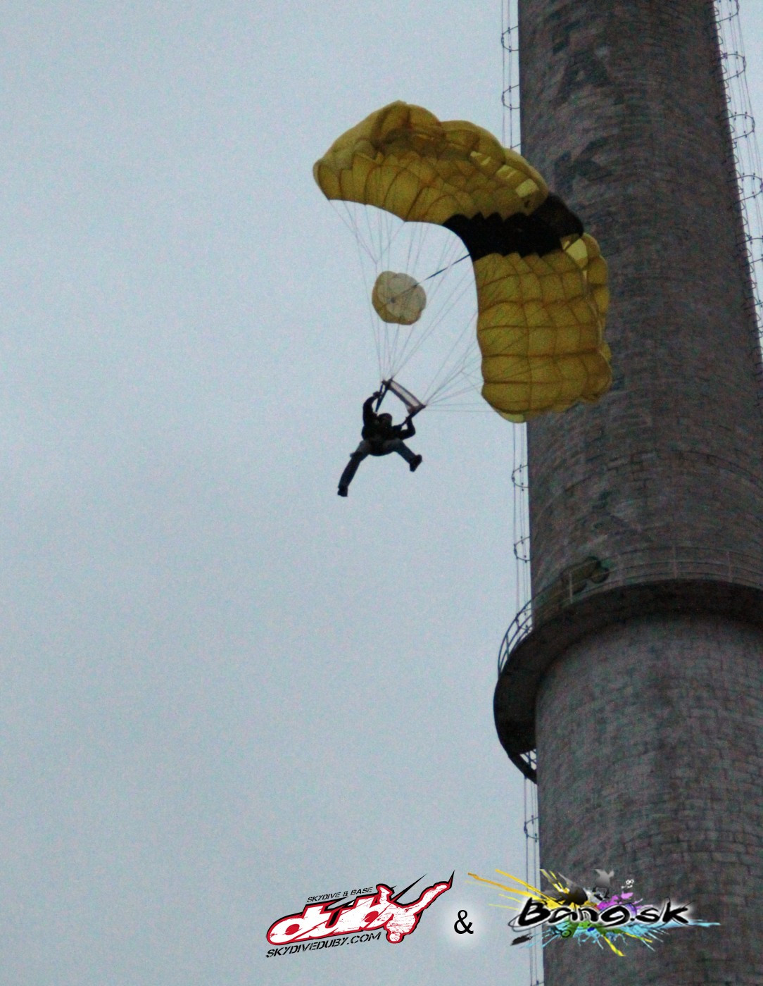 Prichádzam na miesto určenia prvý, akurát sa stihnem vydýchať a už vystupuje z auta jeden nemenovaný slovenský profesionálny base-jumper v sprievode šarmantnej hnedovlásky. Onedlho sú už na mieste aj ľudia z Bang.sk, Wrc Hsp felicia s riders posádkou a Angus. Krátky pokec, nachystanie techniky a už lezieme hore 80 metrovú vežu v zostave Roman, René, Bodkins, Kučo a ja (ncap). Každým poschodím sa ľudia dole zdali menší a menší ...