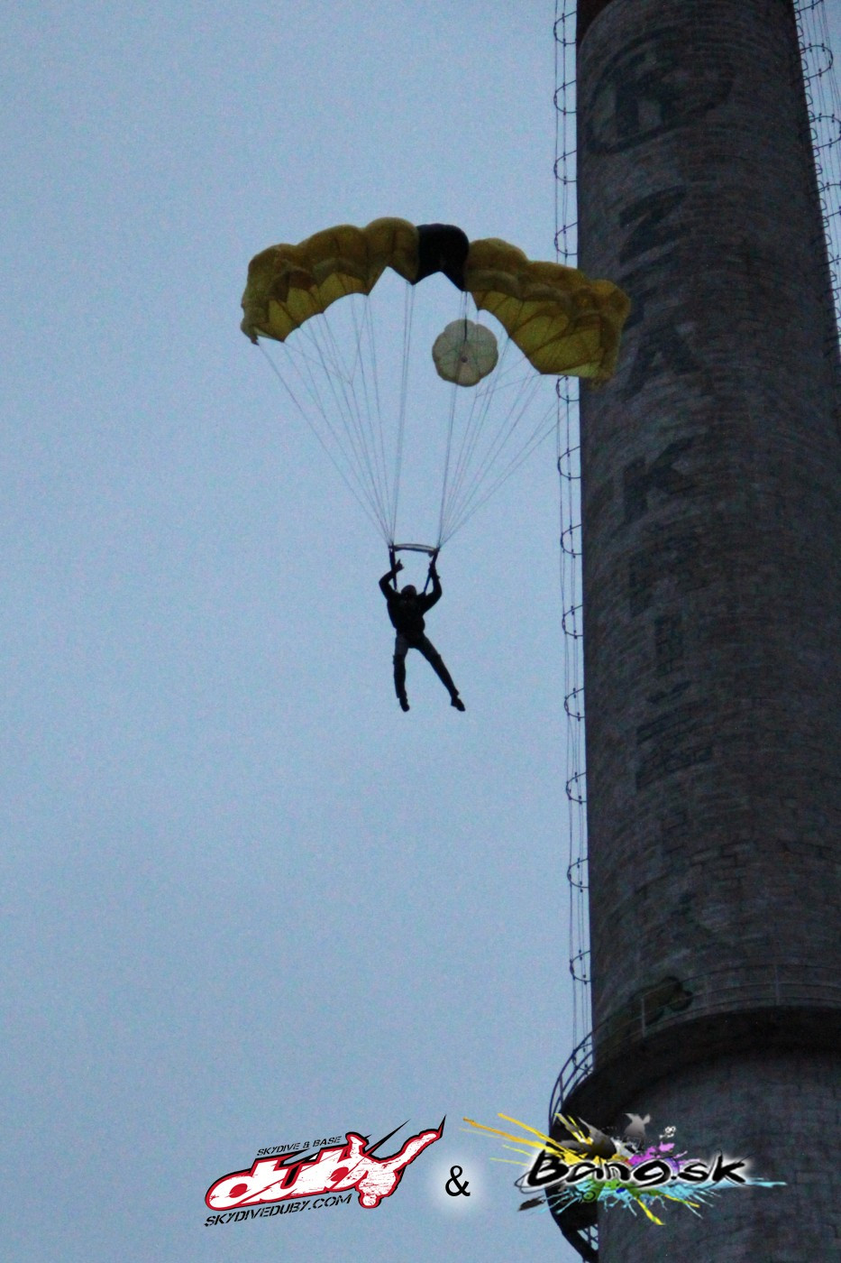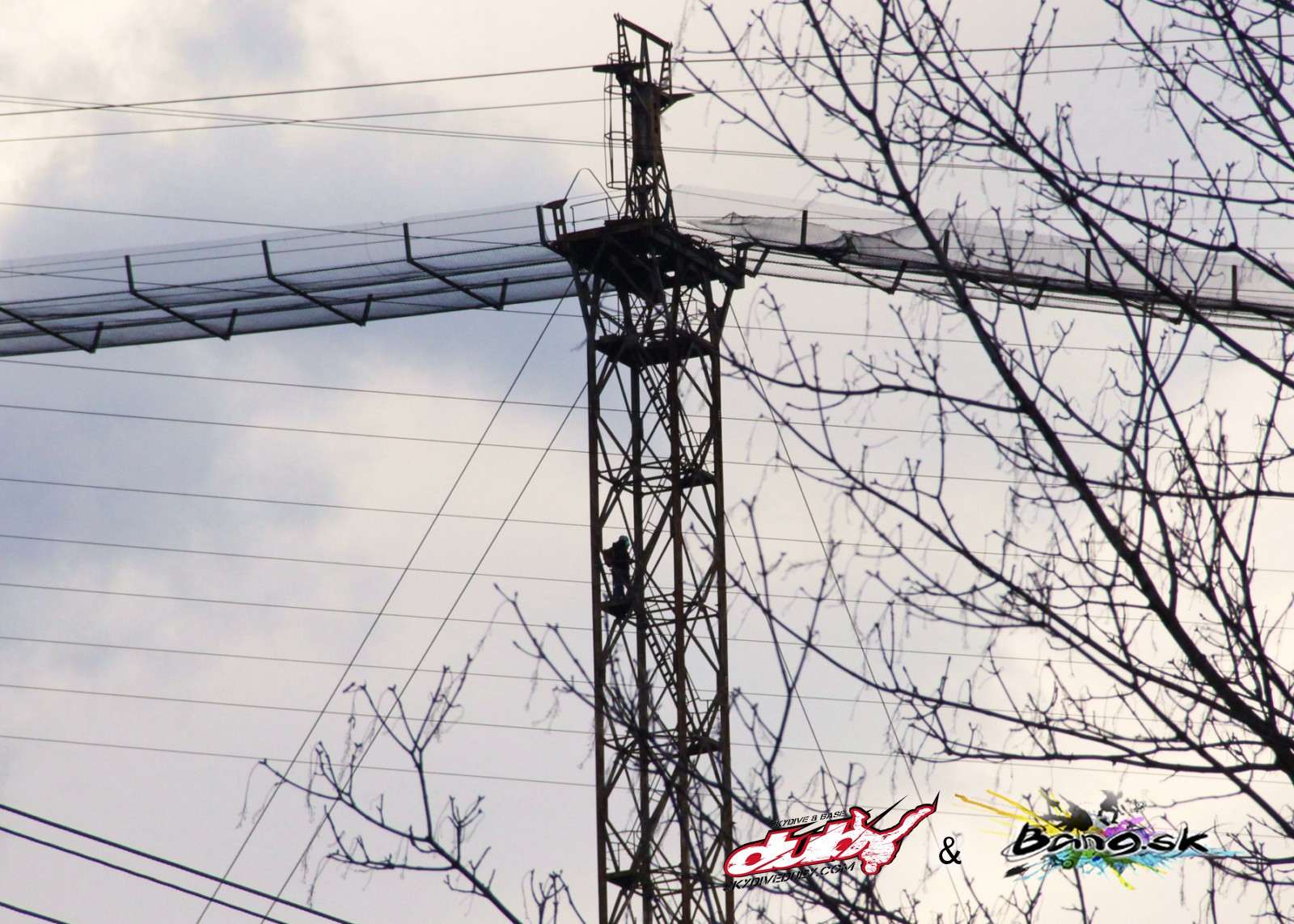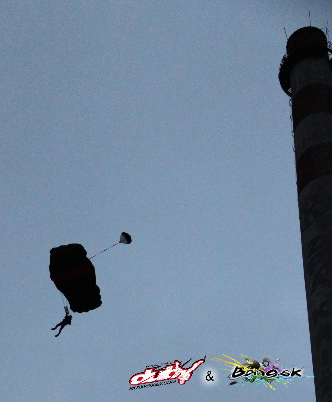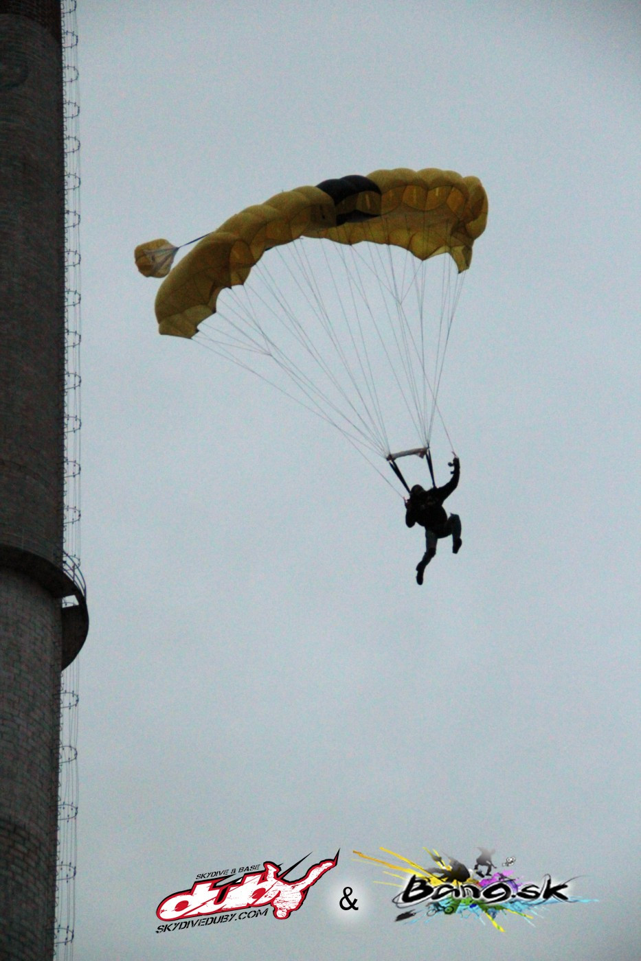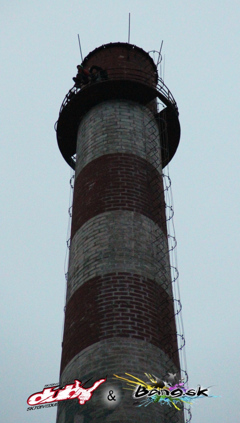 Prichádzam na miesto určenia prvý, akurát sa stihnem vydýchať a už vystupuje z auta jeden nemenovaný slovenský profesionálny base-jumper v sprievode šarmantnej hnedovlásky. Onedlho sú už na mieste aj ľudia z Bang.sk, Wrc Hsp felicia s riders posádkou a Angus. Krátky pokec, nachystanie techniky a už lezieme hore 80 metrovú vežu v zostave Roman, René, Bodkins, Kučo a ja (ncap). Každým poschodím sa ľudia dole zdali menší a menší ...