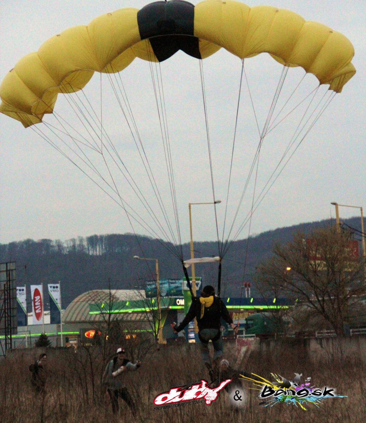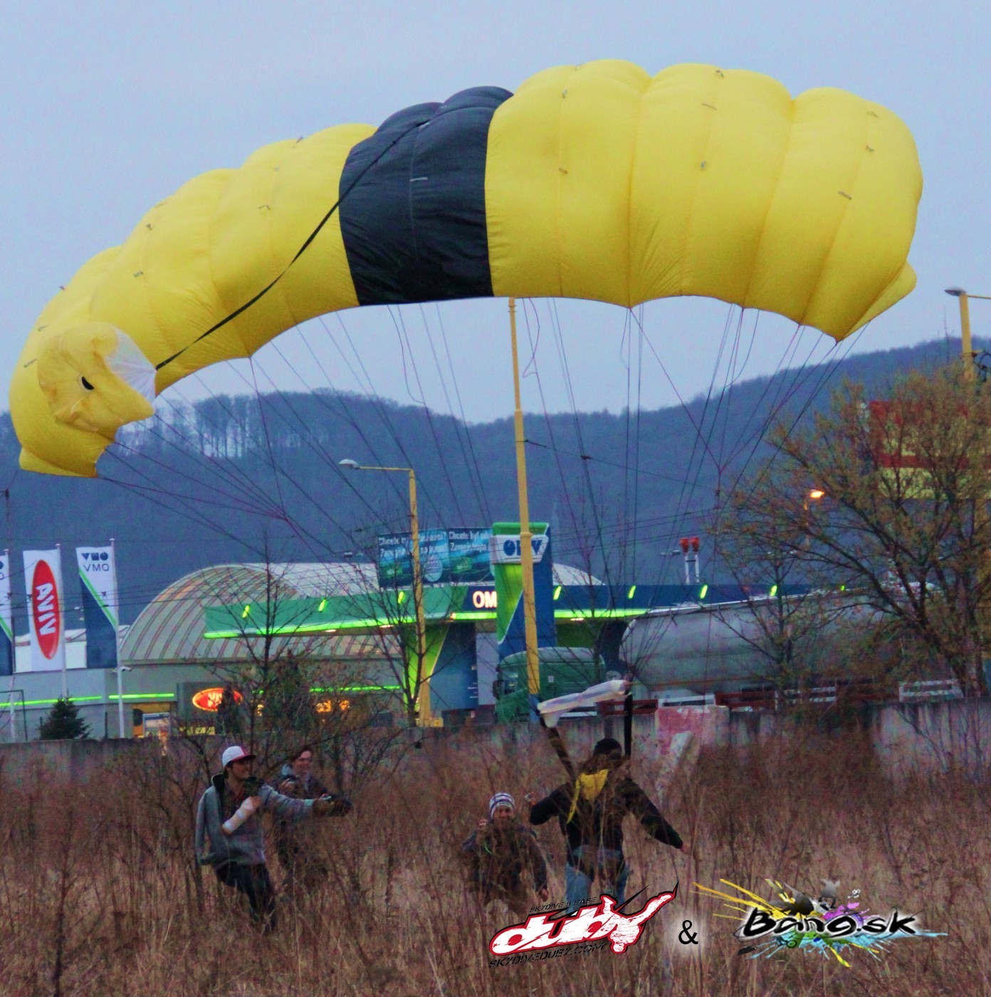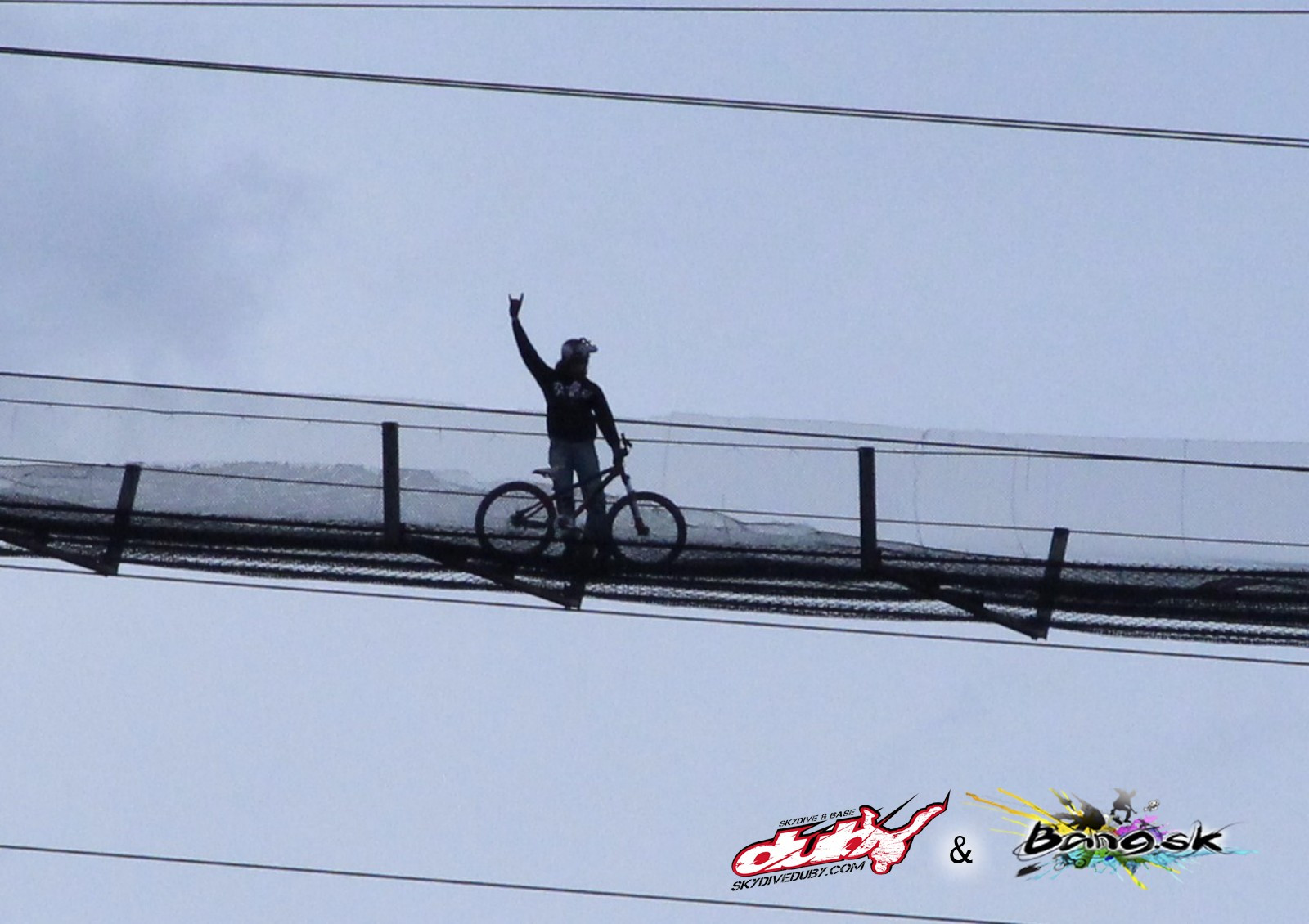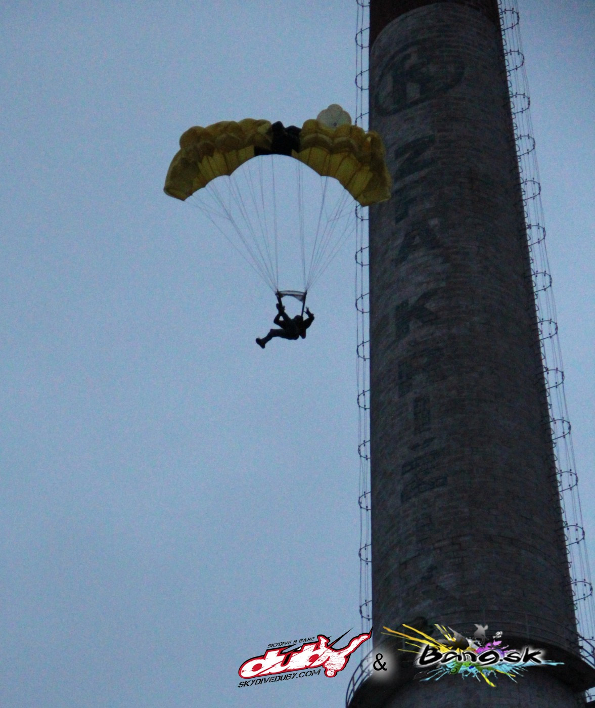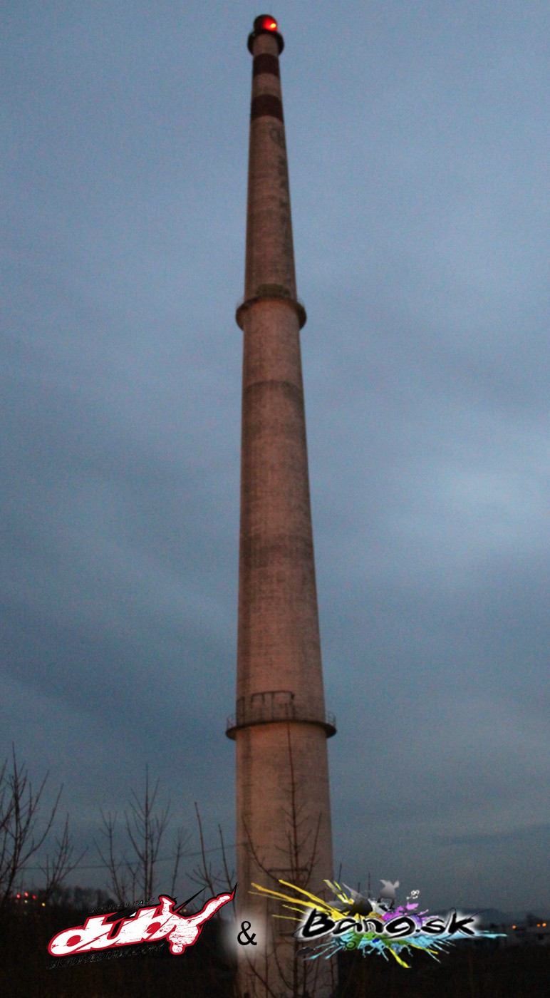 Prichádzam na miesto určenia prvý, akurát sa stihnem vydýchať a už vystupuje z auta jeden nemenovaný slovenský profesionálny base-jumper v sprievode šarmantnej hnedovlásky. Onedlho sú už na mieste aj ľudia z Bang.sk, Wrc Hsp felicia s riders posádkou a Angus. Krátky pokec, nachystanie techniky a už lezieme hore 80 metrovú vežu v zostave Roman, René, Bodkins, Kučo a ja (ncap). Každým poschodím sa ľudia dole zdali menší a menší ...
