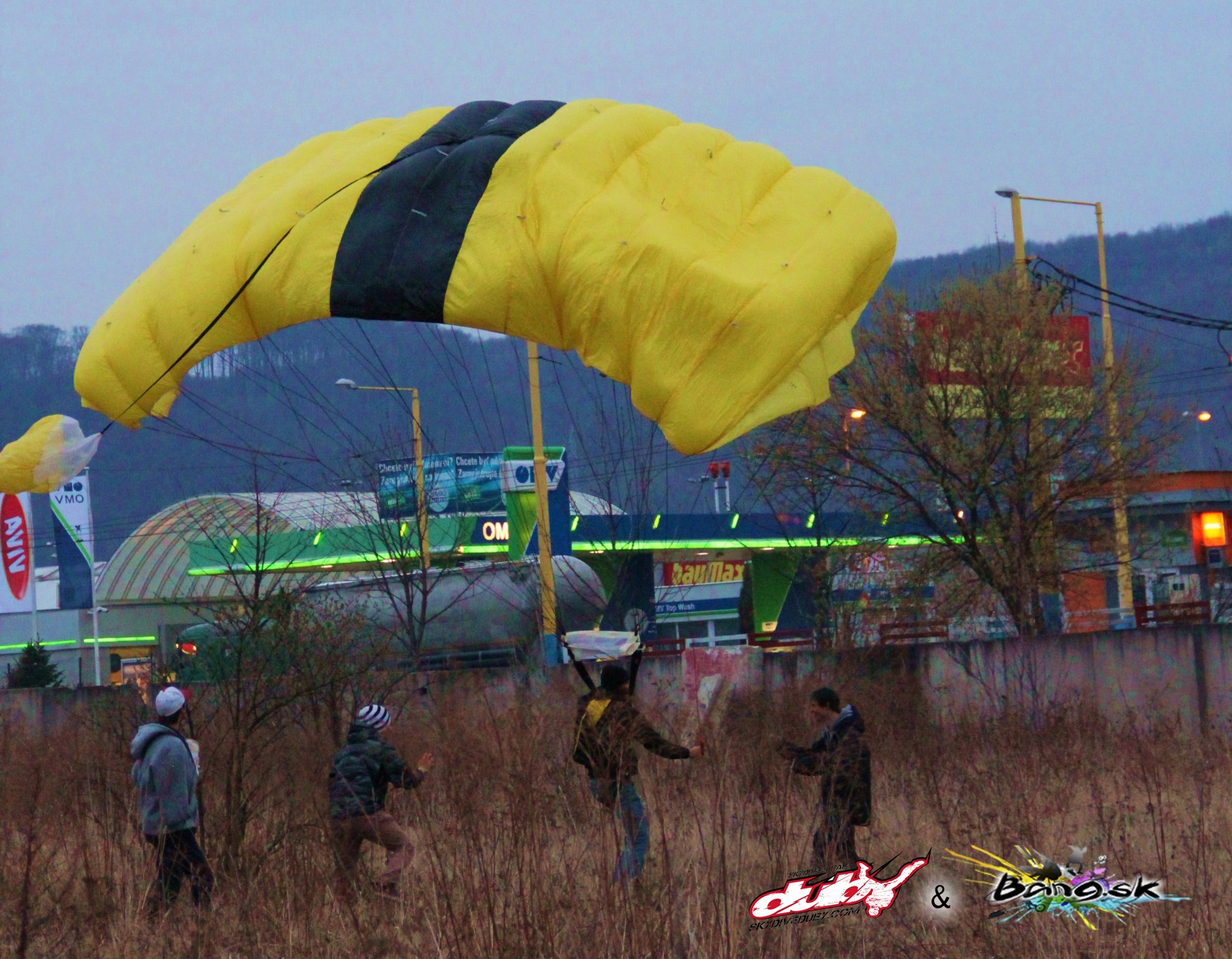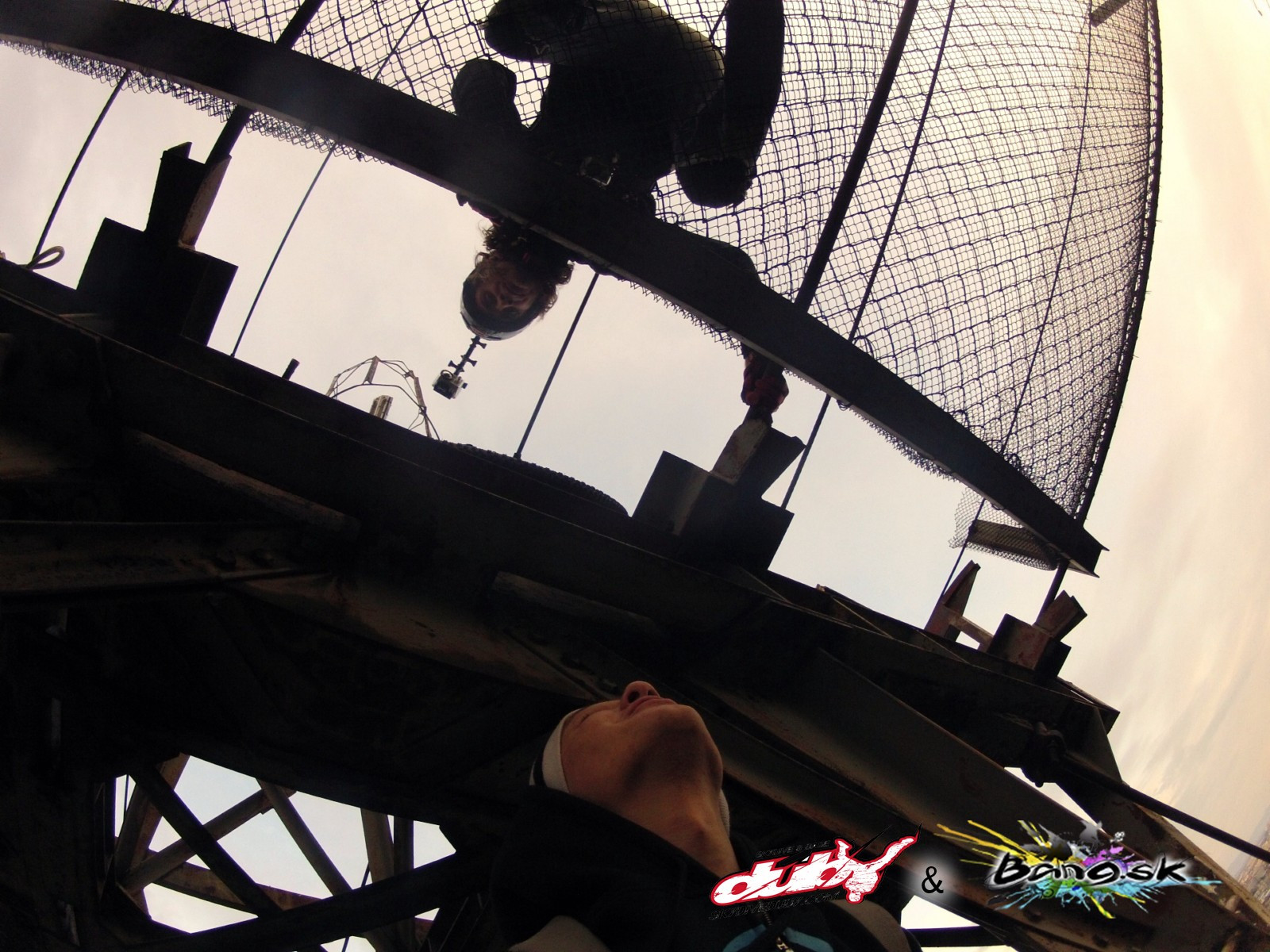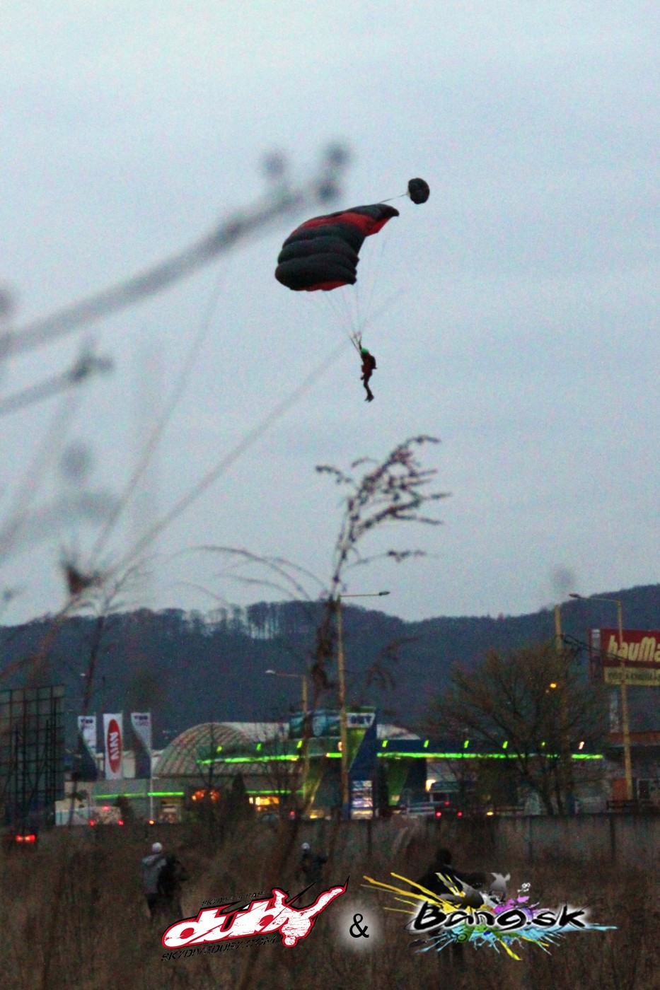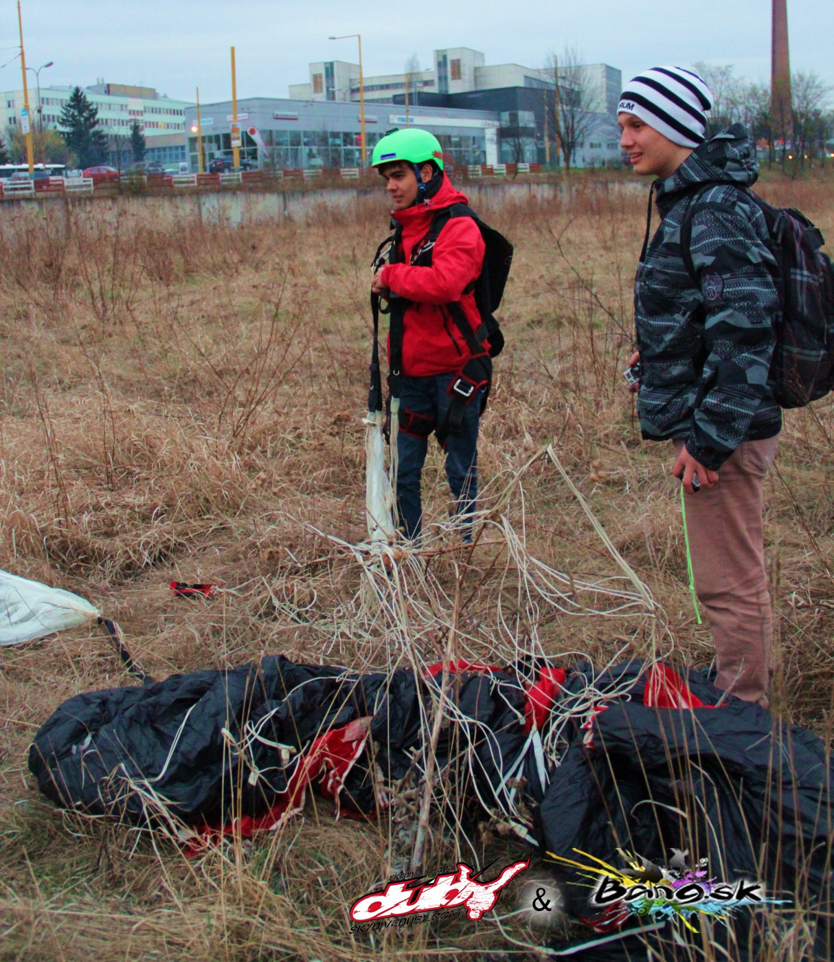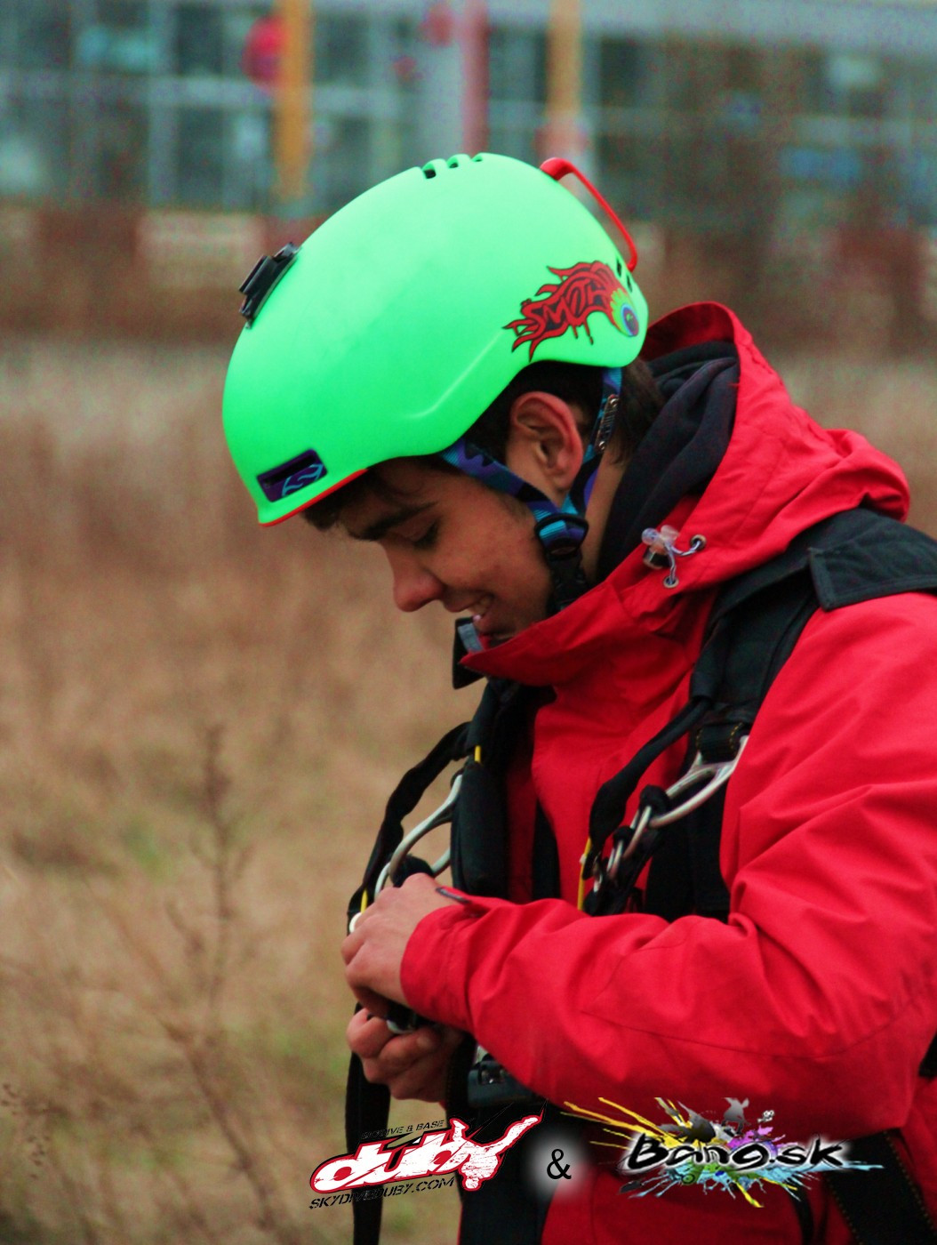 Prichádzam na miesto určenia prvý, akurát sa stihnem vydýchať a už vystupuje z auta jeden nemenovaný slovenský profesionálny base-jumper v sprievode šarmantnej hnedovlásky. Onedlho sú už na mieste aj ľudia z Bang.sk, Wrc Hsp felicia s riders posádkou a Angus. Krátky pokec, nachystanie techniky a už lezieme hore 80 metrovú vežu v zostave Roman, René, Bodkins, Kučo a ja (ncap). Každým poschodím sa ľudia dole zdali menší a menší ...