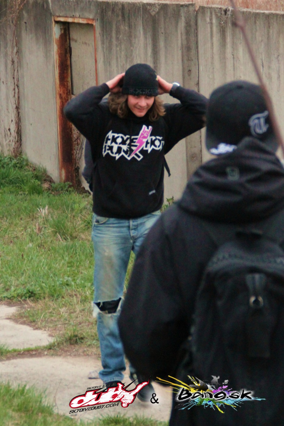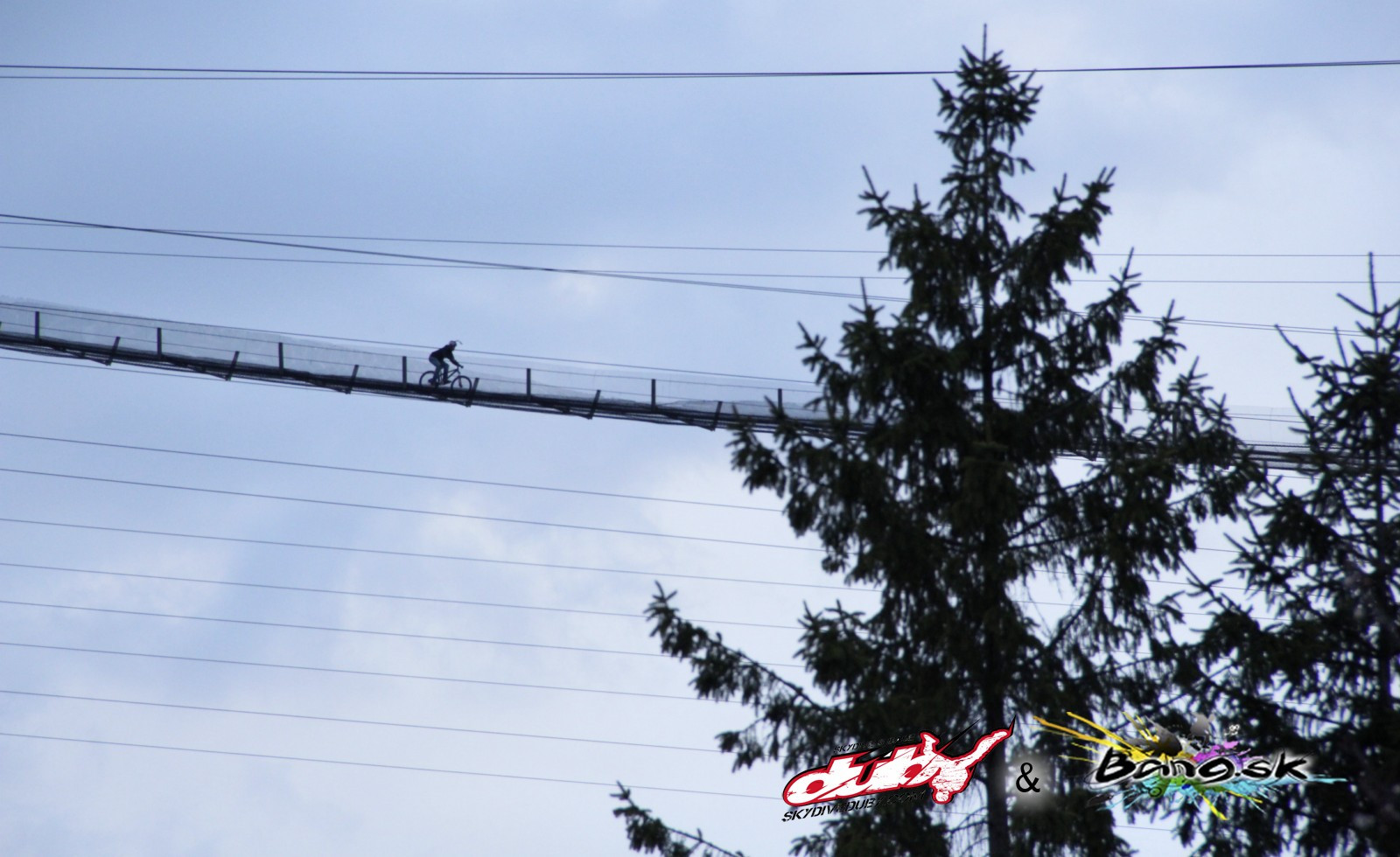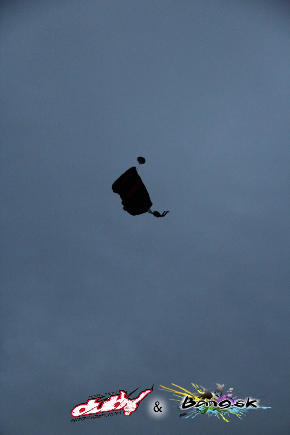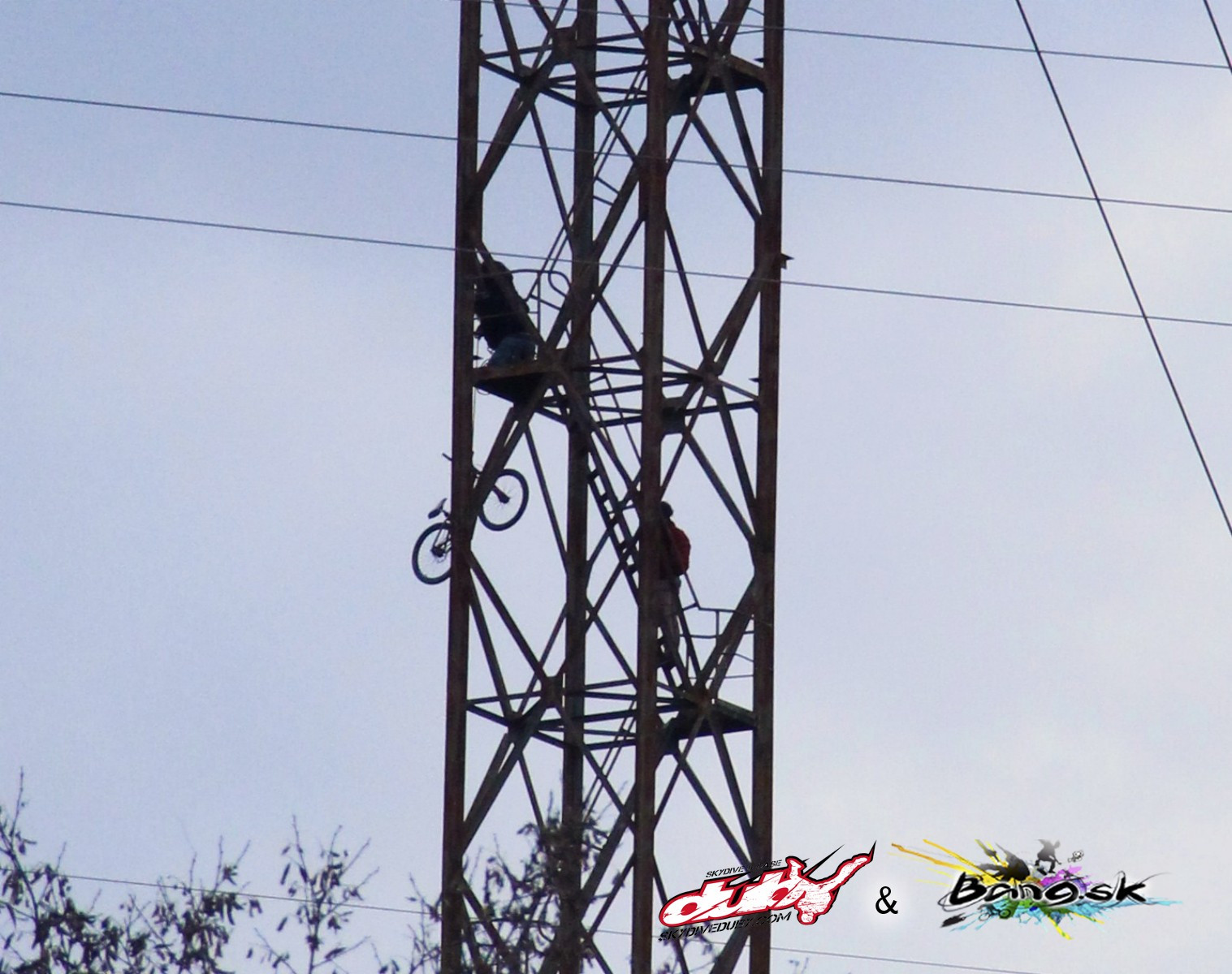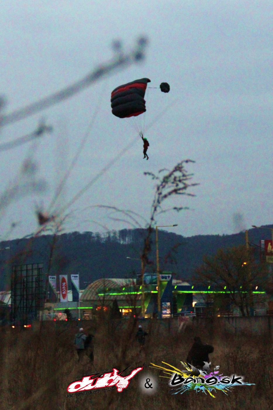 Prichádzam na miesto určenia prvý, akurát sa stihnem vydýchať a už vystupuje z auta jeden nemenovaný slovenský profesionálny base-jumper v sprievode šarmantnej hnedovlásky. Onedlho sú už na mieste aj ľudia z Bang.sk, Wrc Hsp felicia s riders posádkou a Angus. Krátky pokec, nachystanie techniky a už lezieme hore 80 metrovú vežu v zostave Roman, René, Bodkins, Kučo a ja (ncap). Každým poschodím sa ľudia dole zdali menší a menší ...