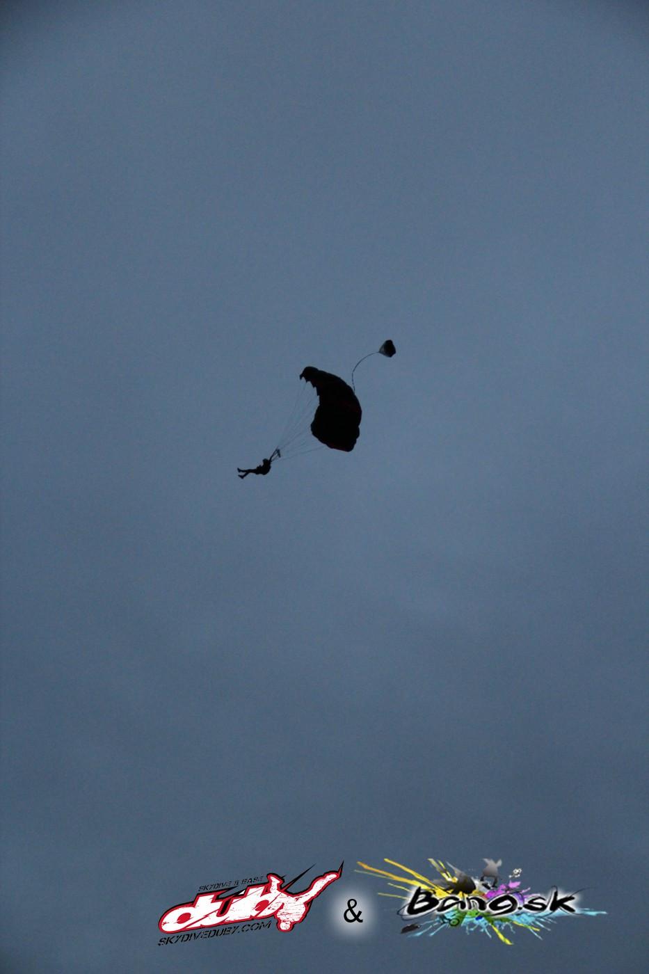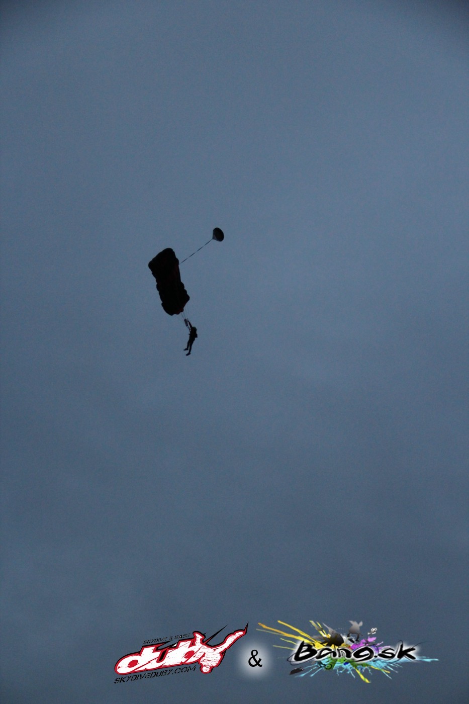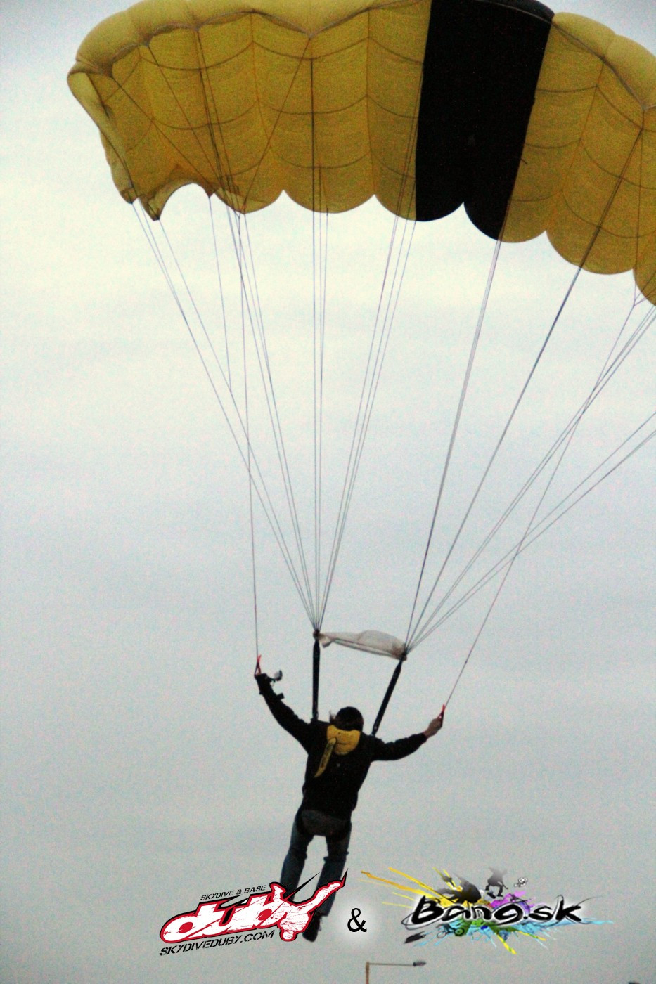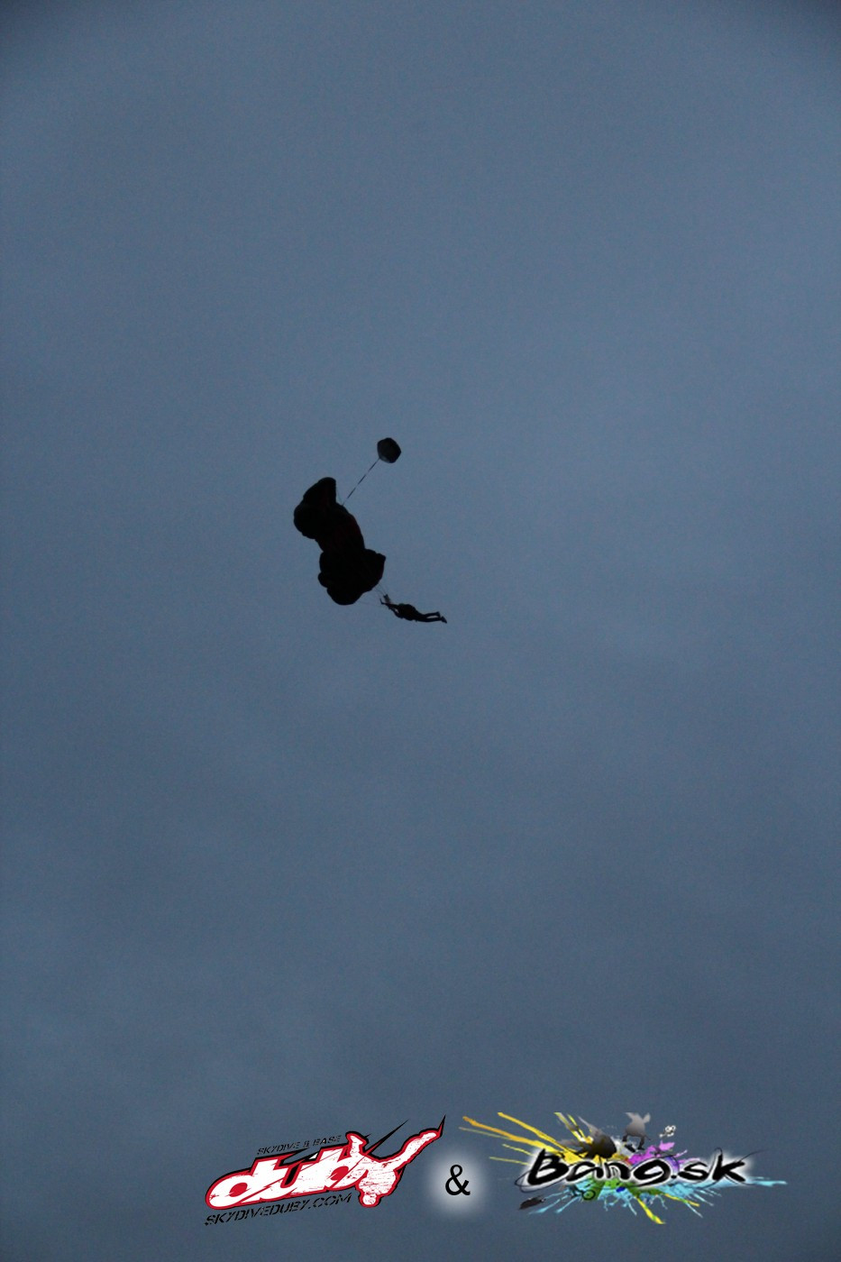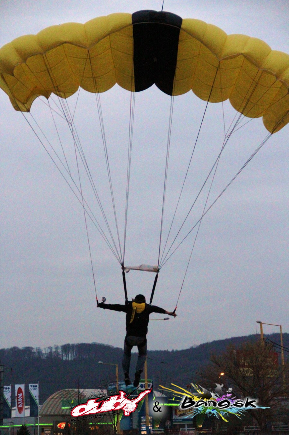 Prichádzam na miesto určenia prvý, akurát sa stihnem vydýchať a už vystupuje z auta jeden nemenovaný slovenský profesionálny base-jumper v sprievode šarmantnej hnedovlásky. Onedlho sú už na mieste aj ľudia z Bang.sk, Wrc Hsp felicia s riders posádkou a Angus. Krátky pokec, nachystanie techniky a už lezieme hore 80 metrovú vežu v zostave Roman, René, Bodkins, Kučo a ja (ncap). Každým poschodím sa ľudia dole zdali menší a menší ...