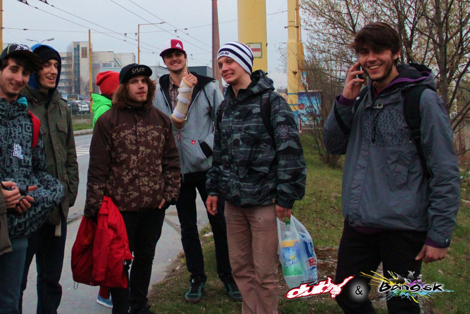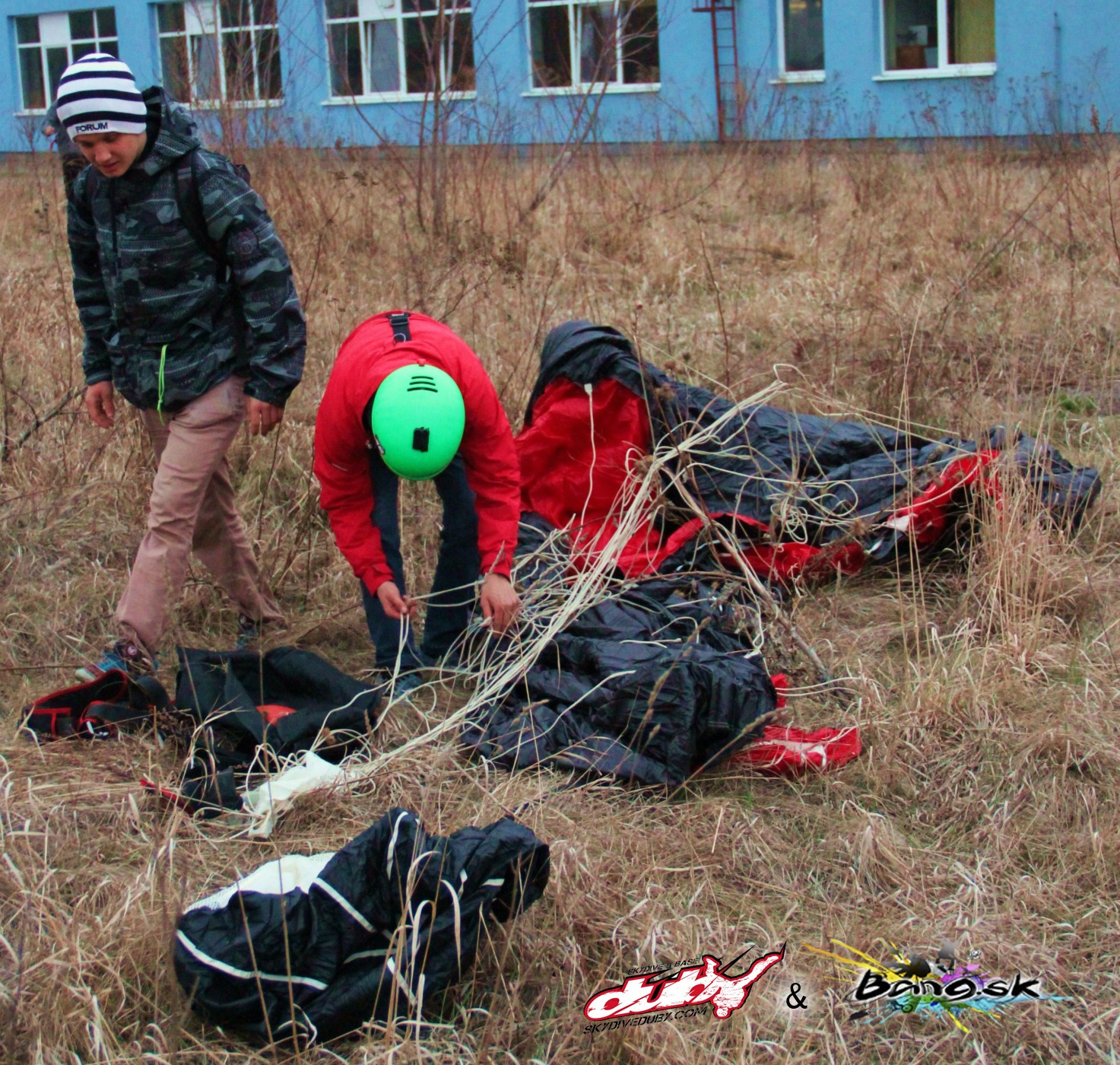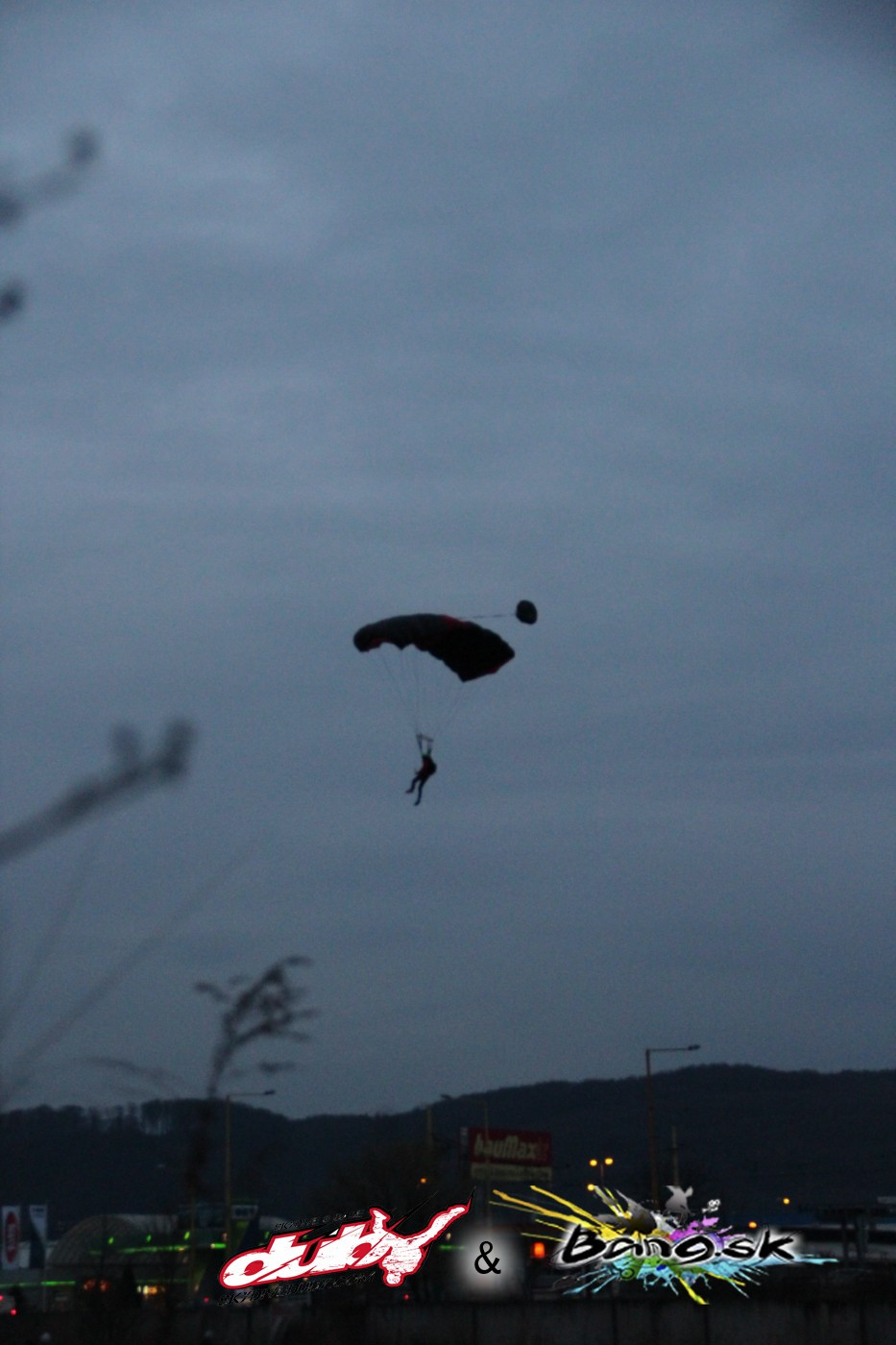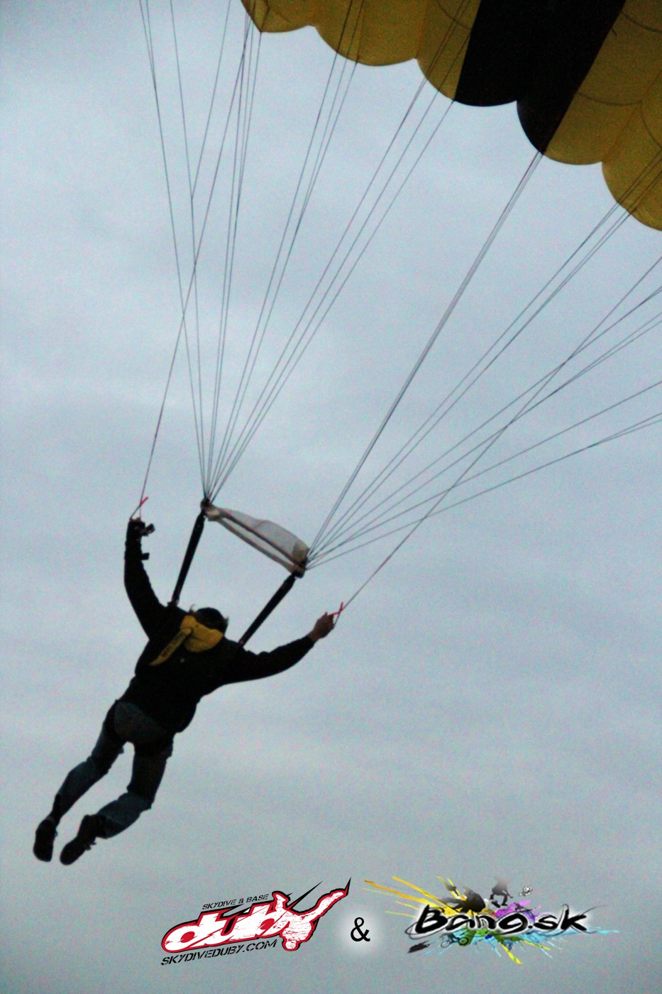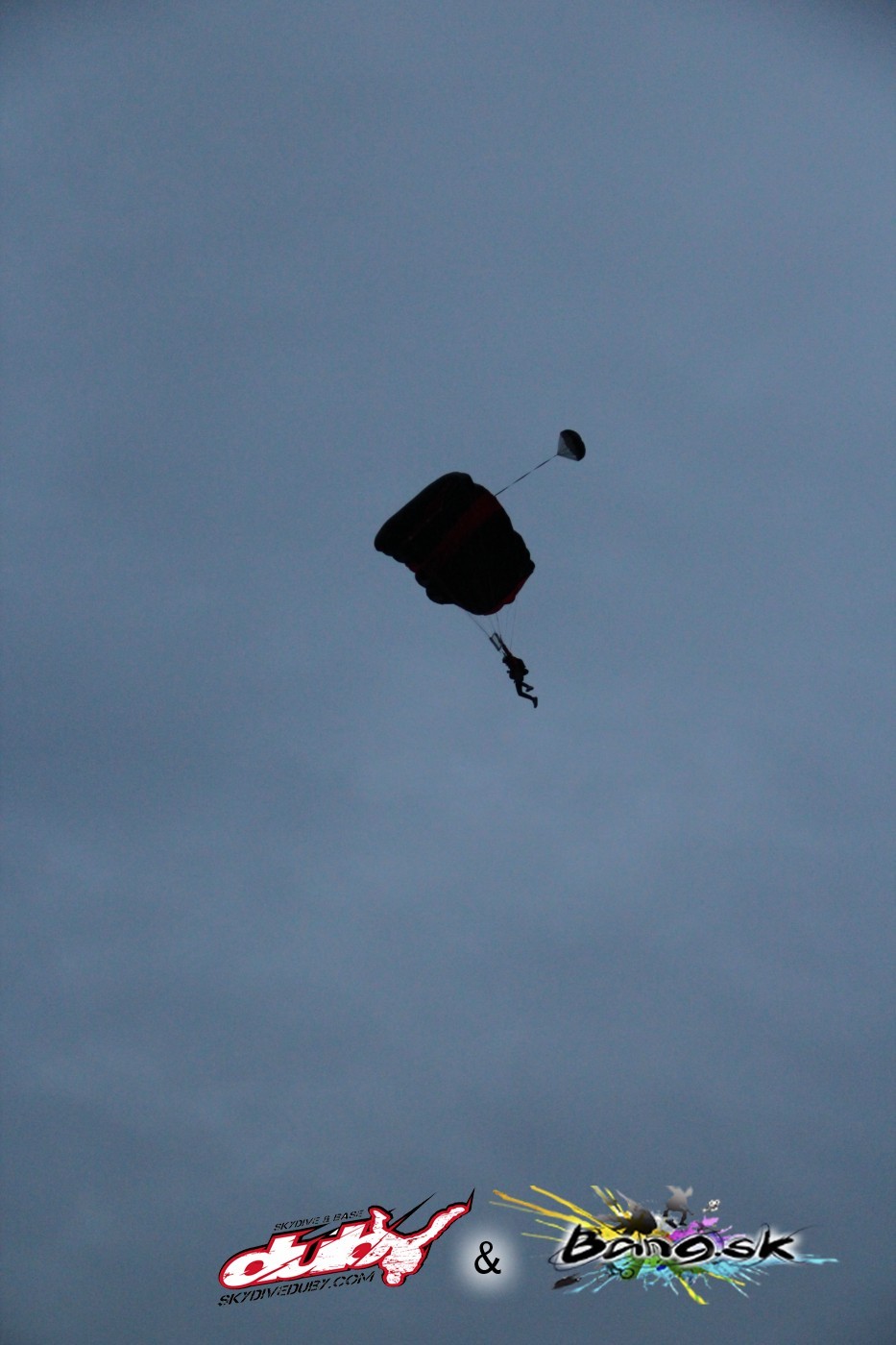 Prichádzam na miesto určenia prvý, akurát sa stihnem vydýchať a už vystupuje z auta jeden nemenovaný slovenský profesionálny base-jumper v sprievode šarmantnej hnedovlásky. Onedlho sú už na mieste aj ľudia z Bang.sk, Wrc Hsp felicia s riders posádkou a Angus. Krátky pokec, nachystanie techniky a už lezieme hore 80 metrovú vežu v zostave Roman, René, Bodkins, Kučo a ja (ncap). Každým poschodím sa ľudia dole zdali menší a menší ...