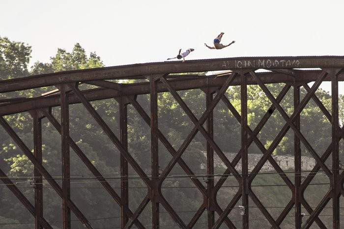 Čerstvý šampión v Svetovej série RedBull Cliff Divingu a profesionálny český skokan sa stretli nad Vltavou a podľahli kúzlu železničného mostu pod Vyšehradom. Vyhliadli si najvyšší bod jeho konštrukcie a z výšky okolo dvadsať metrov za ranného svitu skákali saltá a vruty do Vltavy. Po tomto rozohriatí sa obaja borci presunuli na akciu Highjump do Hříměždic.