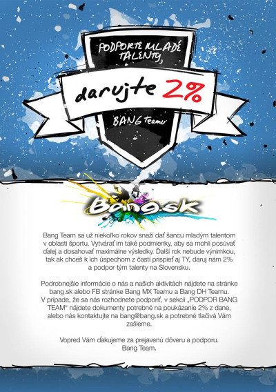 Podrobnejšie informácie o nás a našich aktivitách nájdete v sekcii >DH a MX teamu na našom webe, alebo na FB stránke Bang MX Teamu a Bang DH Teamu. V prípade, že sa nás rozhodnete podporiť stiahnite si Vyhlásenie o poukázaní sumy do výšky 2% a Potvrdenie o zaplatení dane z príjmov alebo nás kontaktujte na maily bang@bang.sk a potrebné tlačivá Vám zašleme.