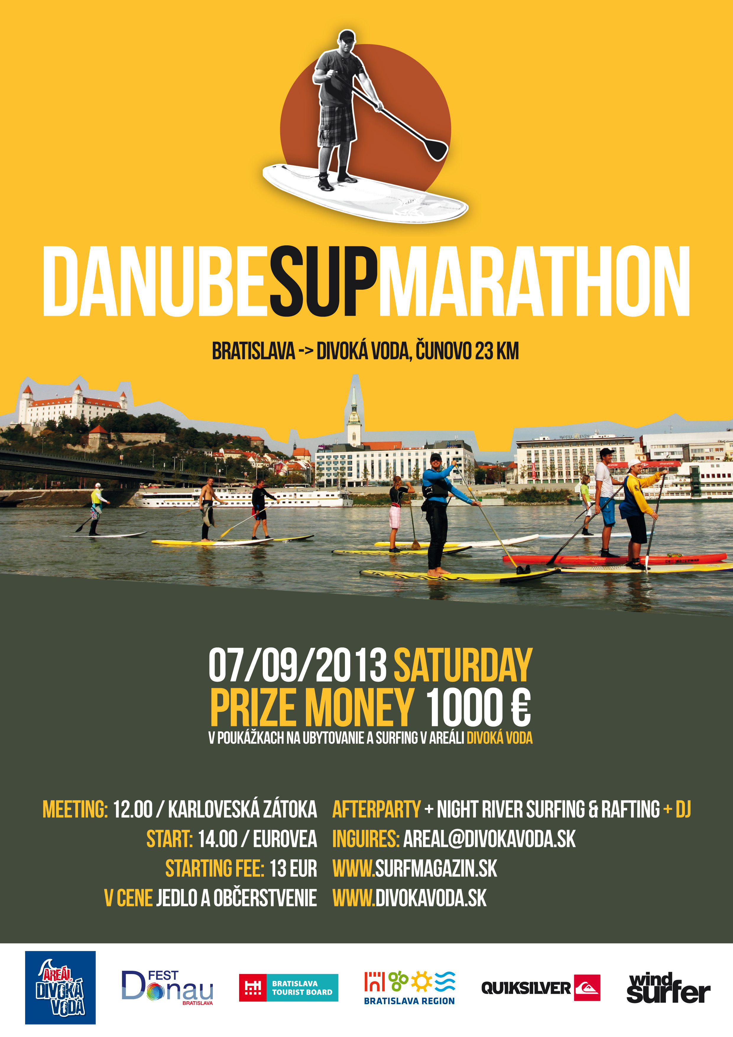 Po minuloročnom zahrievacom kole sa tento rok môžu všetci odvážni jazdci tešiť na druhý ročník Danube SUP marathonu, ktorý sa bude konať 7. 9. 2013. Celá akcia odštartuje o 12tej hodine malou exhibíciou na SUP v Karloveskej zátoke, kde sa súťažiaci spustia po Dunaji k Eurovei. V Eurovei vystúpia a pripravia sa na štart závodu o 14:00 hod., kde odštartovaním skočia do Dunaja a vydajú sa na trať dlhú 23 km do Areálu Divoká Voda v Čunove. Pre prvých troch víťazov čakajú ceny v hodnote 1000 Eur.