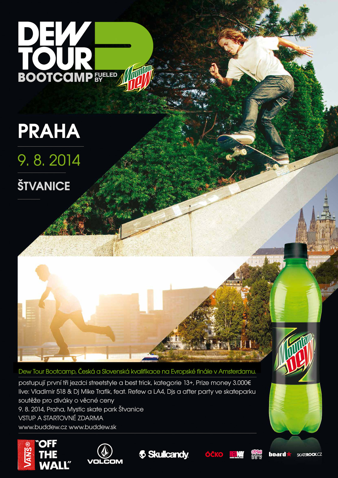 Tento rok v lete, bude Mountain Dew hostiť úplne prvú európsku Dew Tour Am Series. V rámci kvalifikácie do hlavného preteku v Amsterdame sa budú konať Dew Tour Bootcampy v 5-tich európskych krajinách, a to v Holandsku, Veľkej Británii, Dánsku, Švédsku a Českej republike. Česko-Slovenská časť sa koná v najlepšom domácom skateparku v Prahe na Štvanici, kde sa koná aj svetový pohár Mystic Sk8 Cup. Prví traja pretekári a víťaz best trick contestu z týchto krajín pôjdu na konečnú zastávku Dew Tour Bootcamp, ktorá sa bude konať 31. augusta v Amsterdame, v rámci najväčšieho holandského festivalu Museumplein. Odtiaľ potom jeden víťaz zamieri do New Yorku ako VIP hosť na pretek Dew Tour Toyota City v Brooklyne a bude mať možnosť sledovať najlepších svetových profesionálnych pretekárov v jedinečnom streetstyle konteste, ktorý sa koná v kultovom House of Vans v Brooklyne.