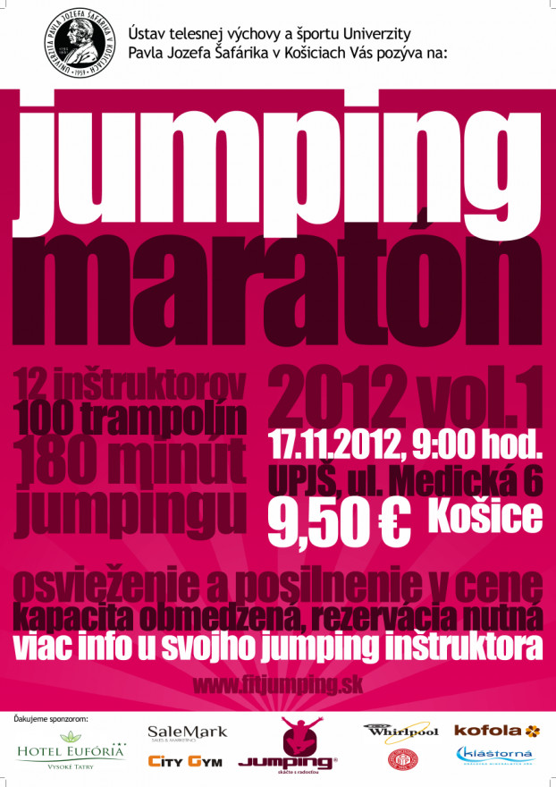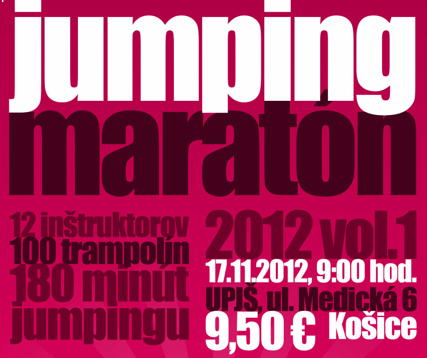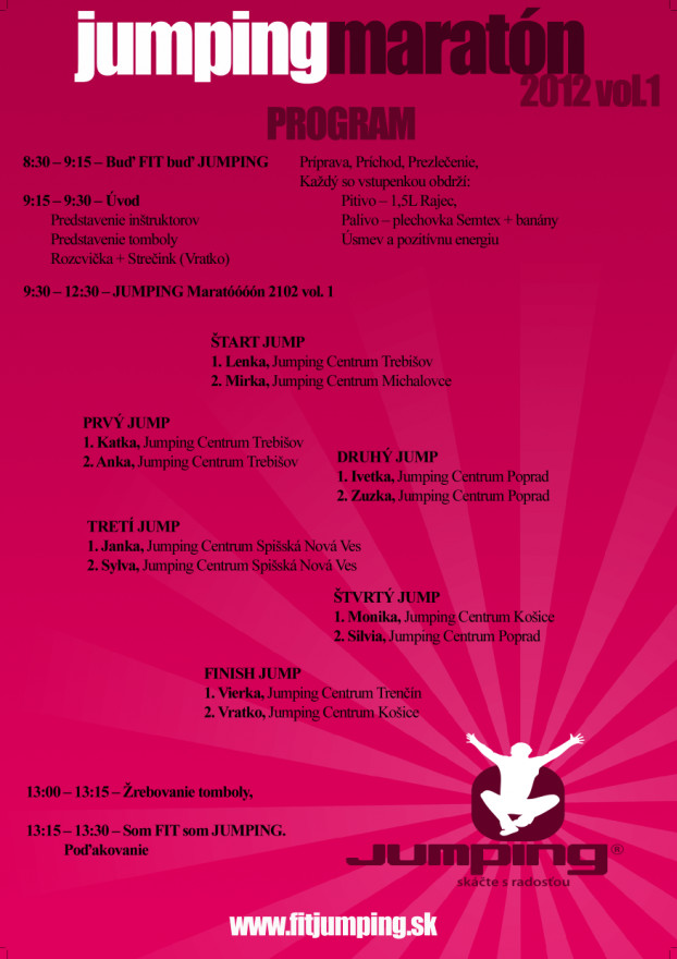 Tak neváhajte a príďte na JUMPING maratón. Ešte je stále pár voľných miest. K dispozícii budete mať 12 inštruktorov, 100 trampolín a užijete si 180 minút jumpingu. Vstuptné je 9,50 v ktorom máš aj niečo na osvieženie a posilnennie. Tešiť sa môžte aj na tombolu v ktorej si možno práve TY vyskáčeš luxusný relaxačný pobyt pre dve osoby.