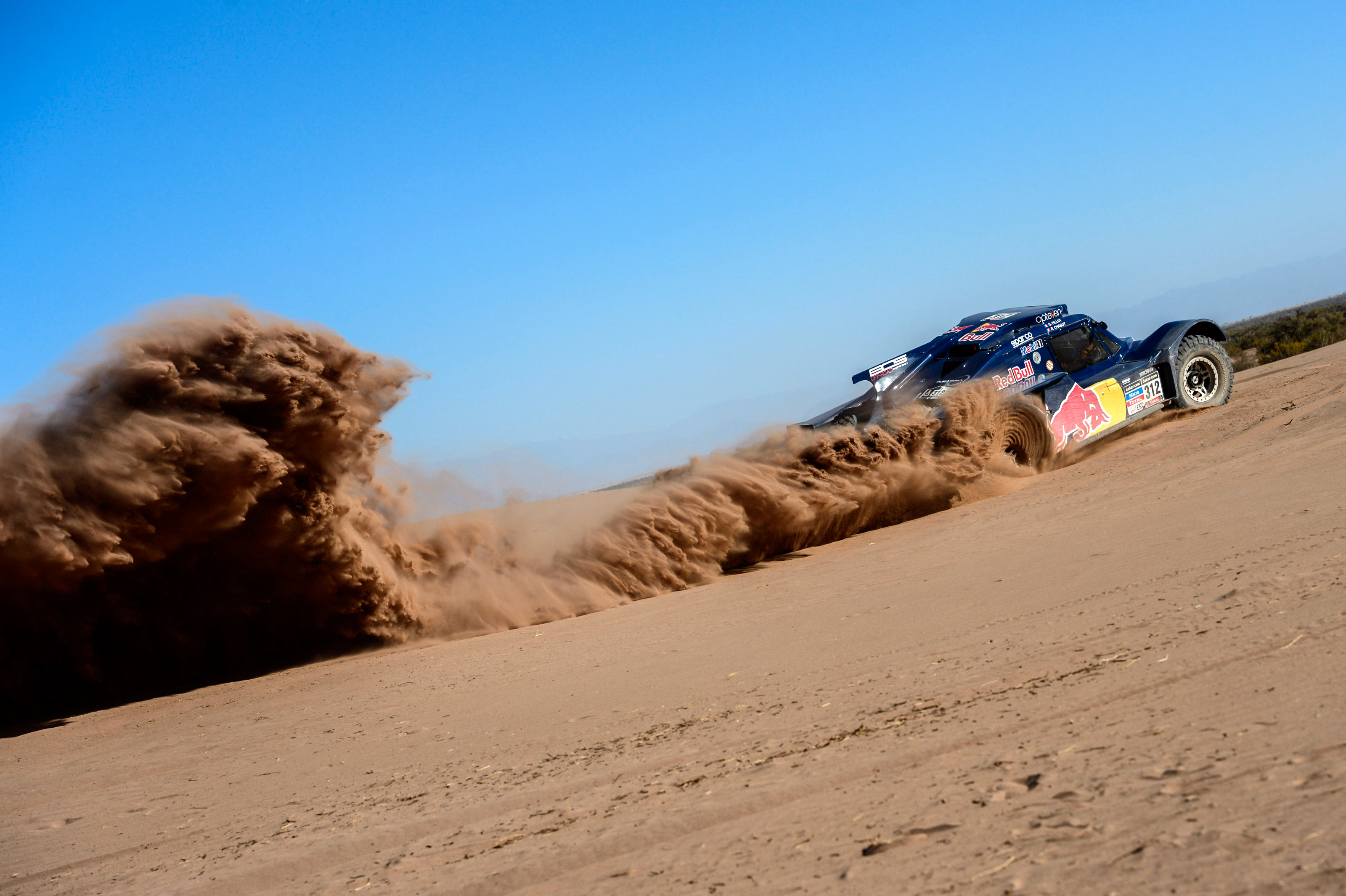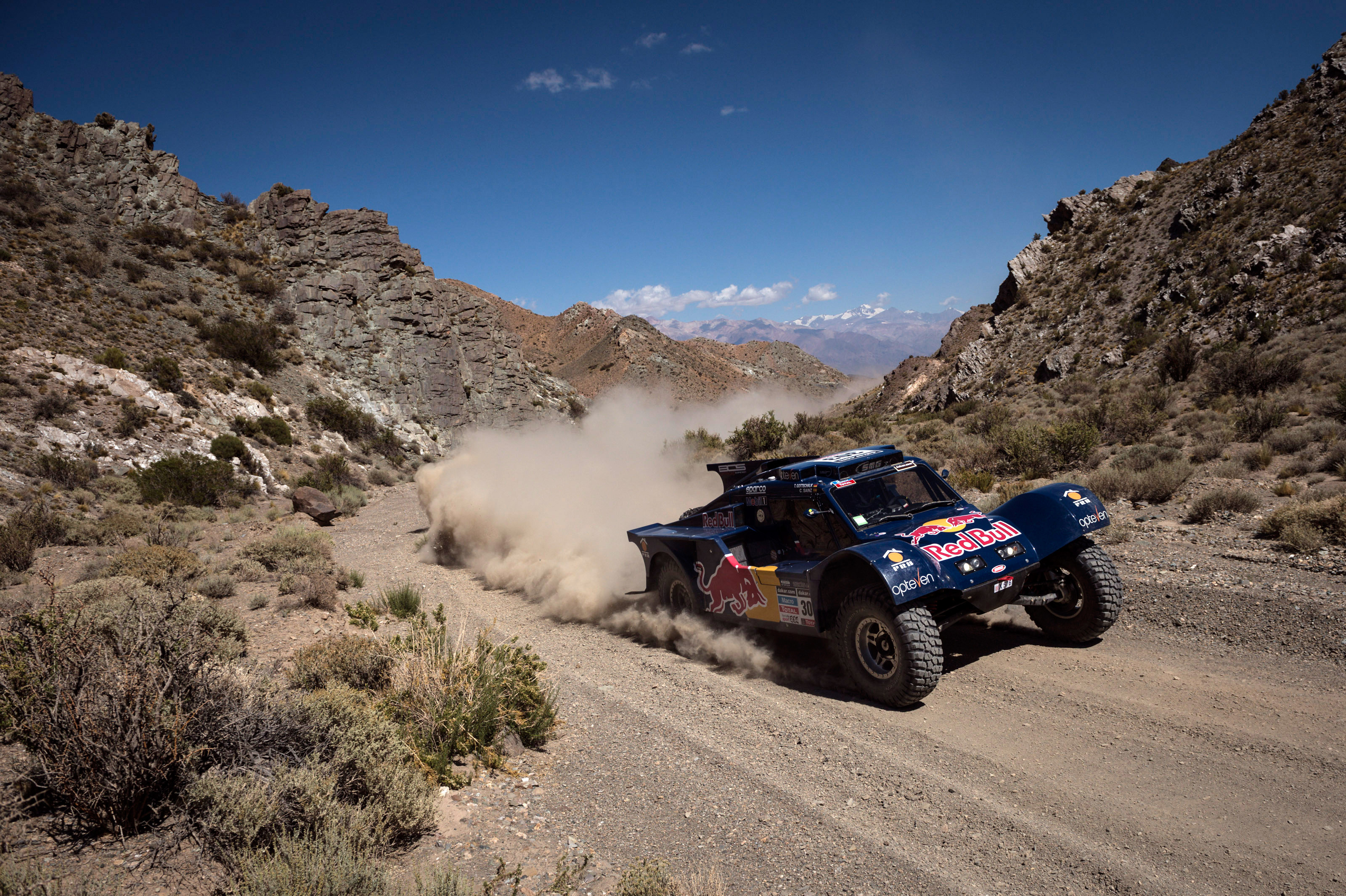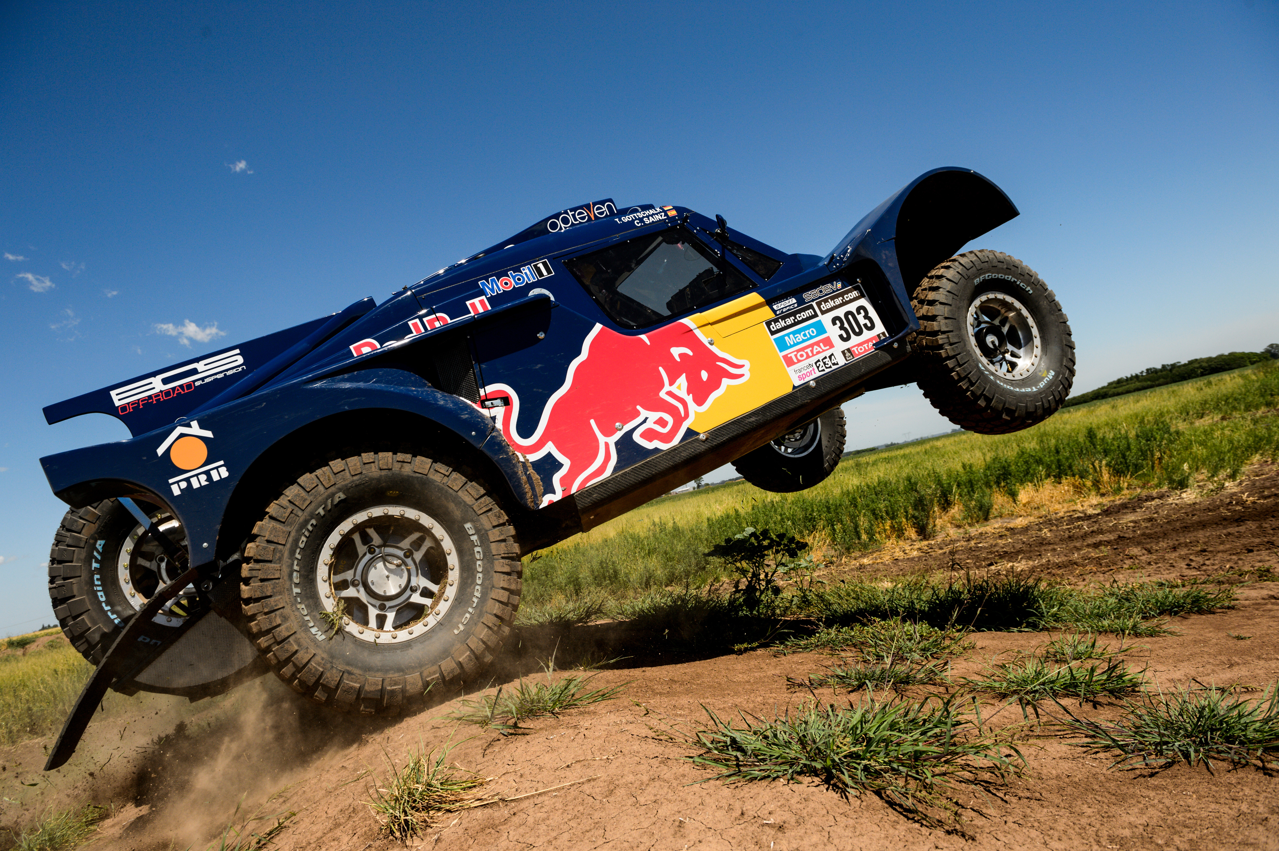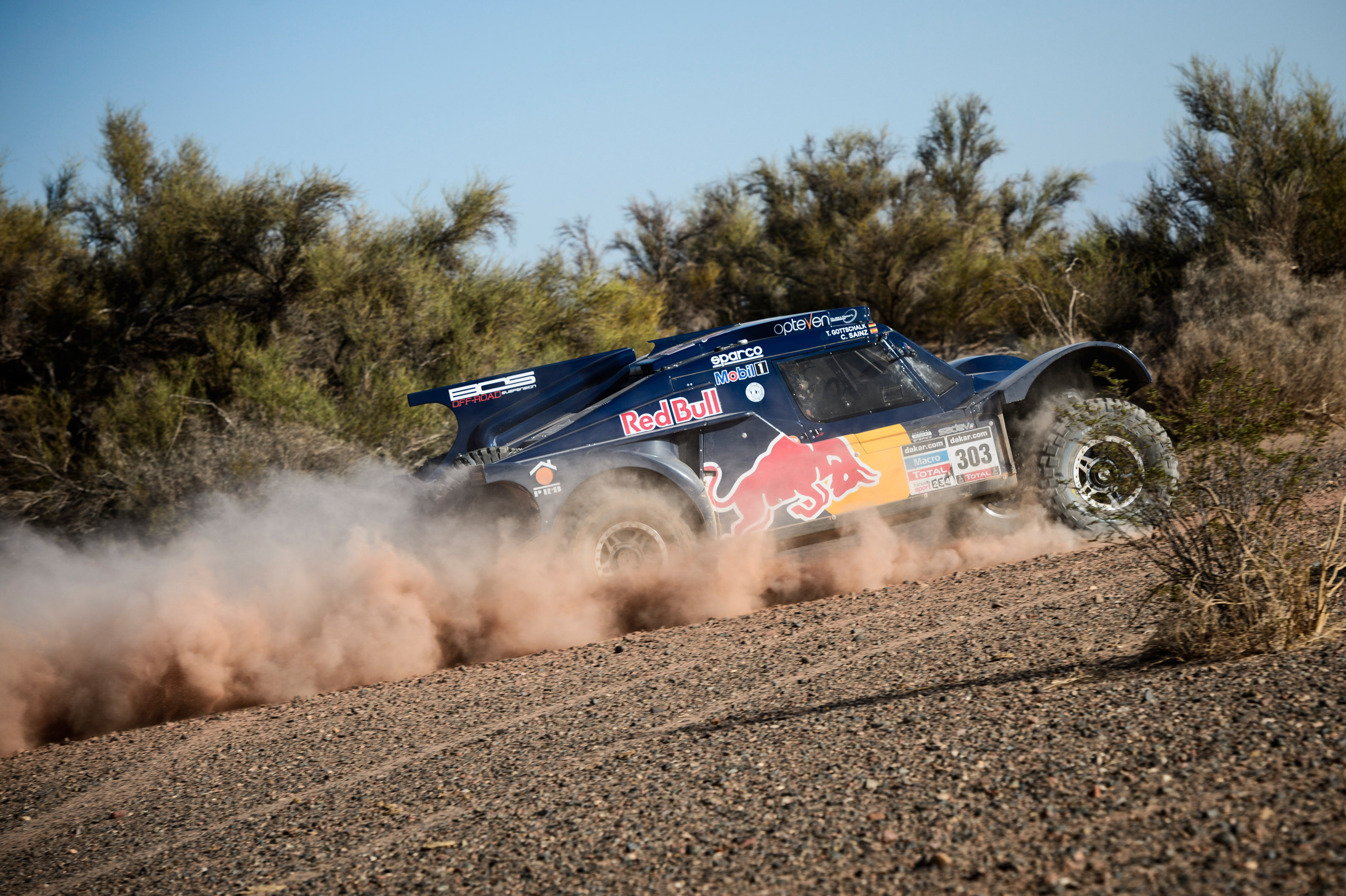 Autá ovládli jazdci na MINI. Prvý je ROMA, druhý TERRANOVA a tretí PETERHANSEL. Na foto redbull bugina SMG a Carlos Sainz.