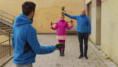 Tie ukazujú, ako chlapík za pomoci pingpongovej rakety doslova vrhá nože na oproti stojacu slečnu, ktorá ich bez mihnutia oka zachytáva pomocou ďalšieho páru rakiet. Po úvodnom „rozohriatí“ nasleduje ešte nebezpečnejší kúsok, pri ktorom odvážlivec prepolí ananás umiestnený na hlave neobyčajne pokojnej dievčiny. Celé vystúpenie zakončí presne miereným úderom, po ktorom tentokrát už pingpongová loptička skončí v ústach spomenutej slečny.