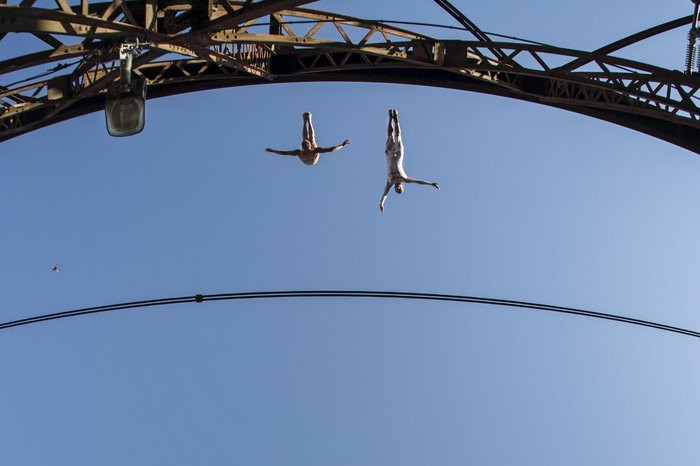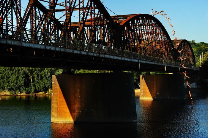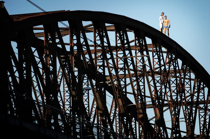 Čerstvý šampión v Svetovej série RedBull Cliff Divingu a profesionálny český skokan sa stretli nad Vltavou a podľahli kúzlu železničného mostu pod Vyšehradom. Vyhliadli si najvyšší bod jeho konštrukcie a z výšky okolo dvadsať metrov za ranného svitu skákali saltá a vruty do Vltavy. Po tomto rozohriatí sa obaja borci presunuli na akciu Highjump do Hříměždic.