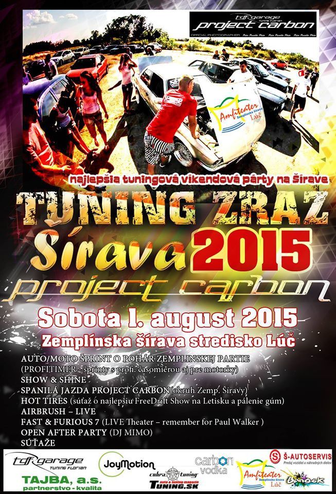 Všetci milovníci automobilov, spálených gúm a krásnych žien si budú môcť prvý augustový víkend na Šírave v stredisku LÚČ užiť TUNING ZRAZ 2015 PROJECT CARBON. Organizátori si pre Vás pripravili pestrý program. Nebudú chýbať šprinty, súťaž o najlepšiu Free Drift Show na Letisku a pálenie gúm, spanilá jazda project carbon a mnoho ďalších. Okrem nadupaných áut a výkonov, akciu spríjemní aj Car wash SHOW so sexi hosteskami a afterparty. Takže neváhaj a 1. augusta zavítaj na TUNING ZRAZ ŠÍRAVA 2015.